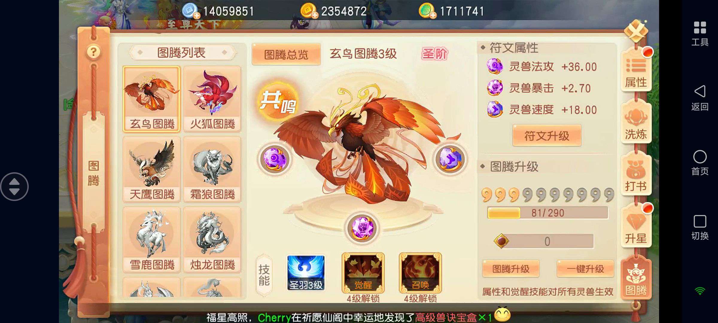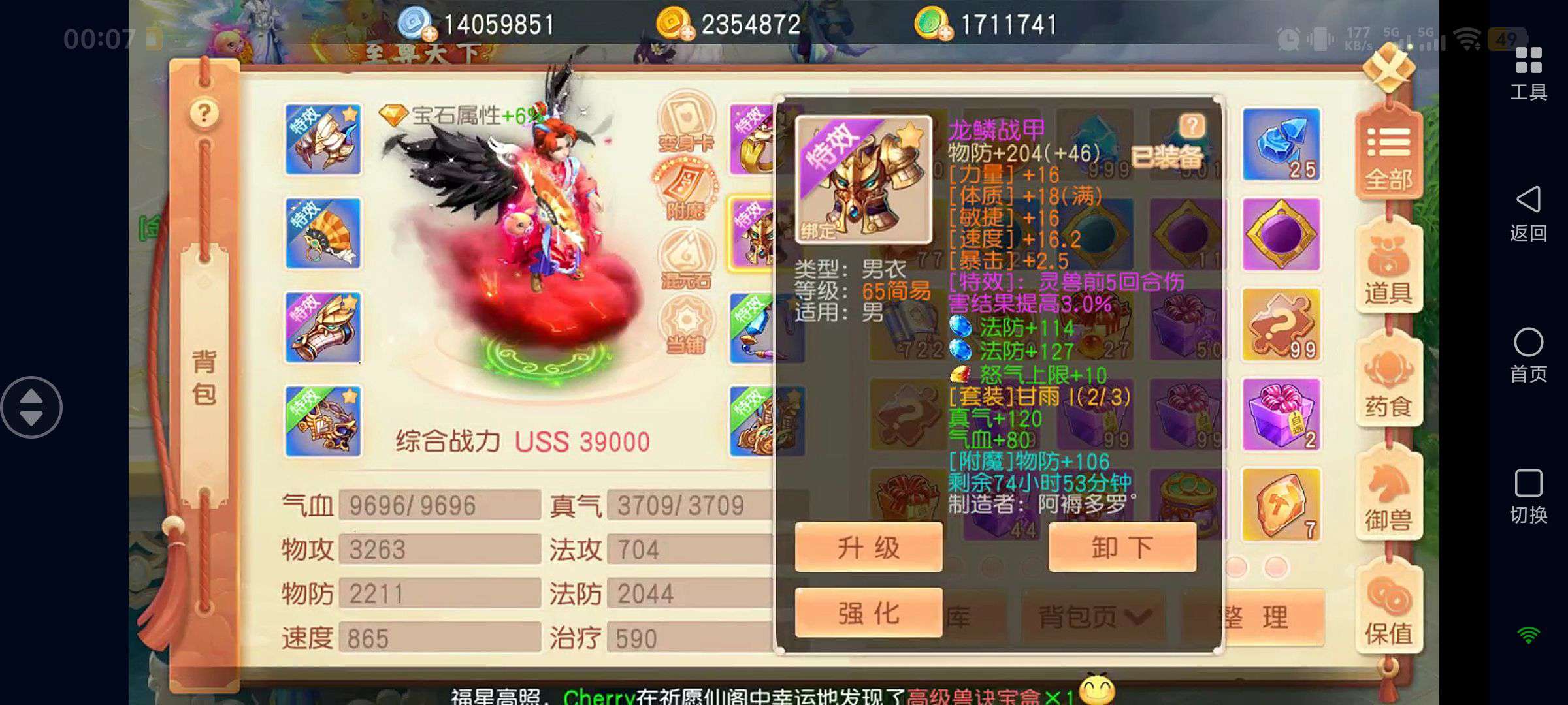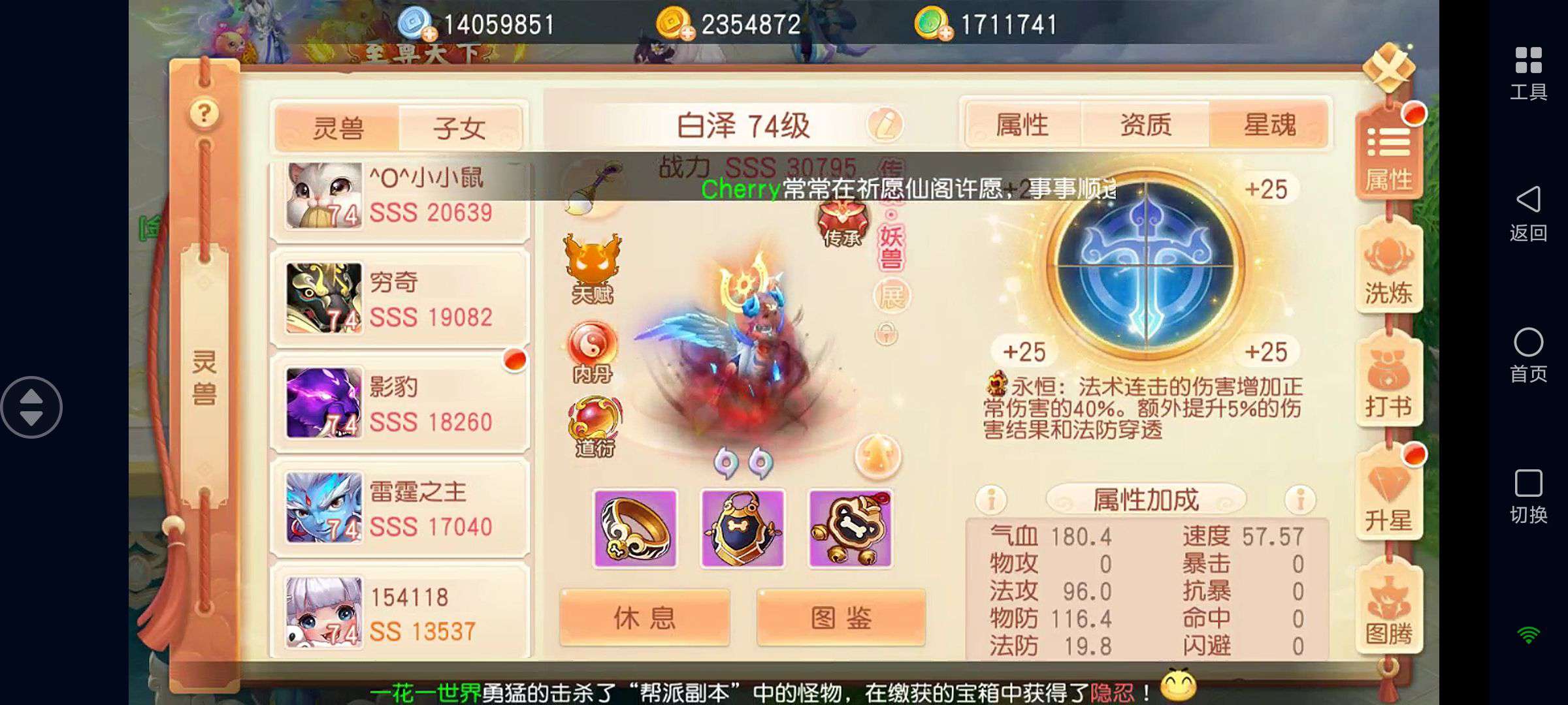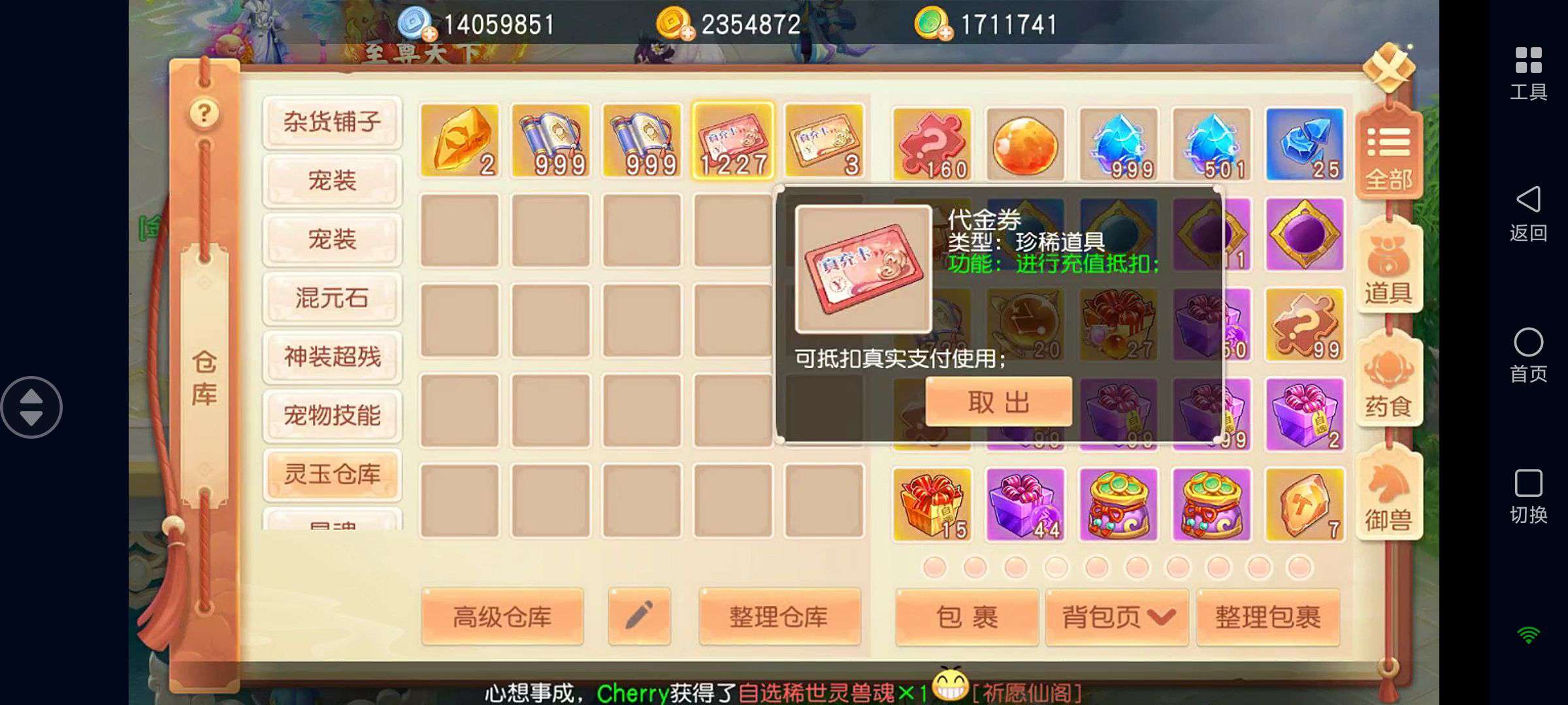 如图!装备全是灵兽增伤特效,其他仓库基本都是满的,各种资源都有……