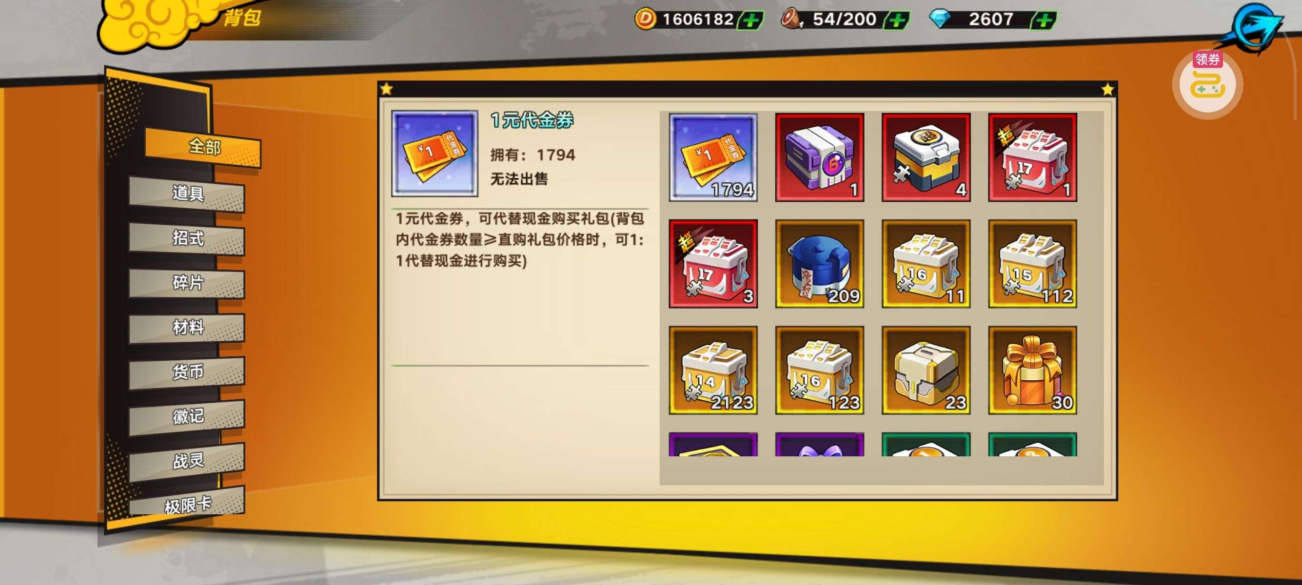 进阶丹*200,铜钱*100000,查克拉*100000(每个账号限领一次)