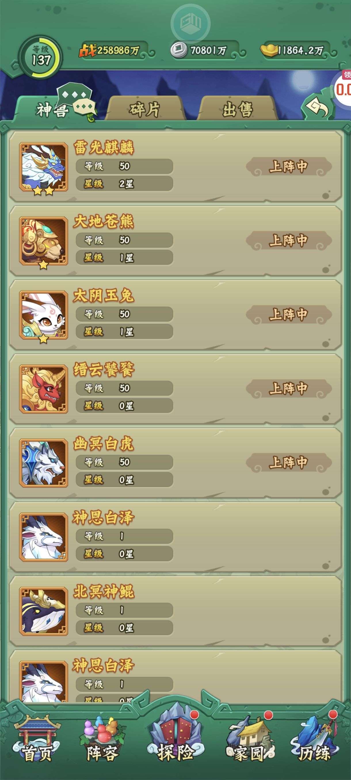 角色95级,充了50多,有几个神兽,小蝴蝶小金刚有皮肤