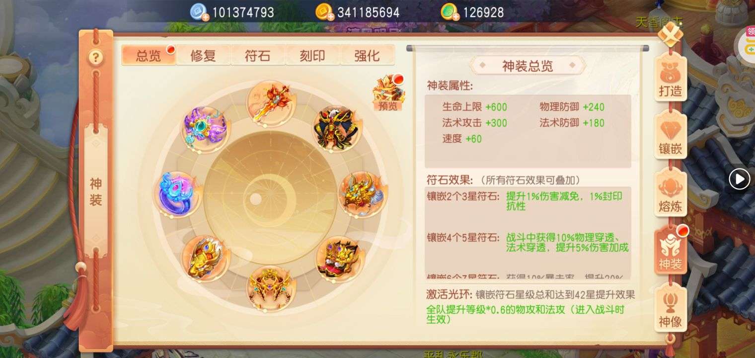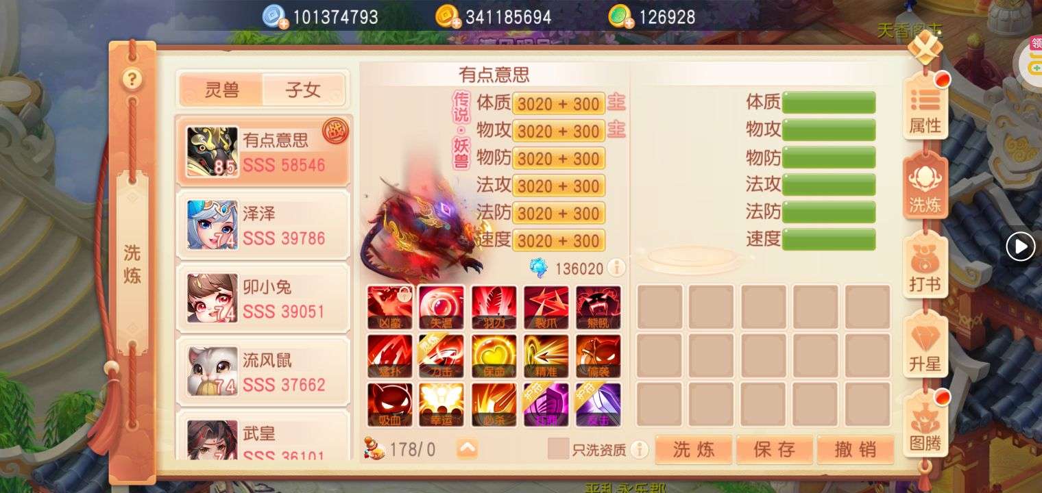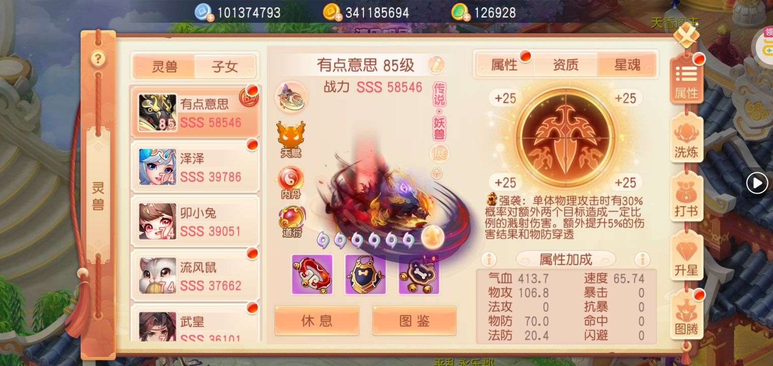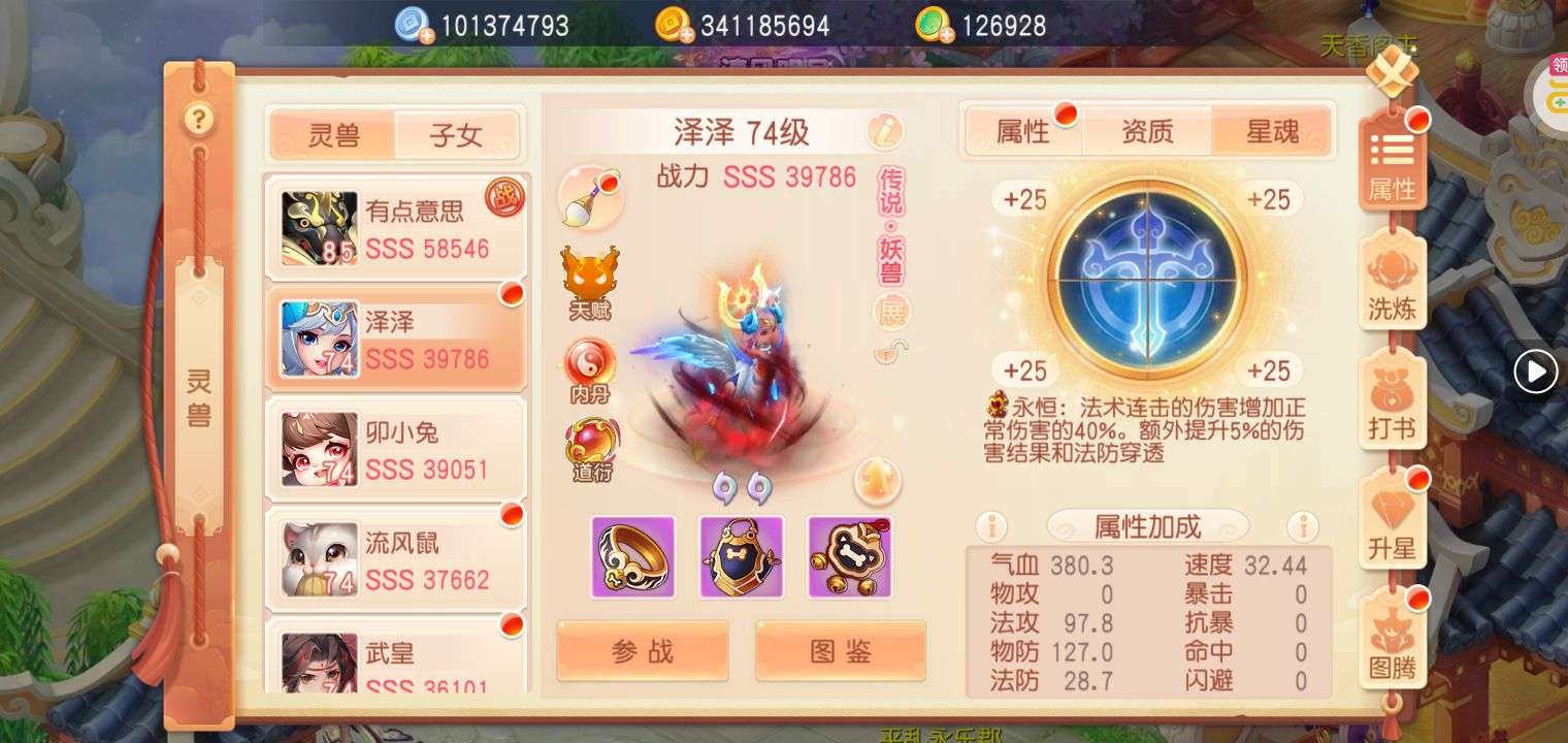 如图!装备全是灵兽增伤特效,其他仓库基本都是满的,各种资源都有……
