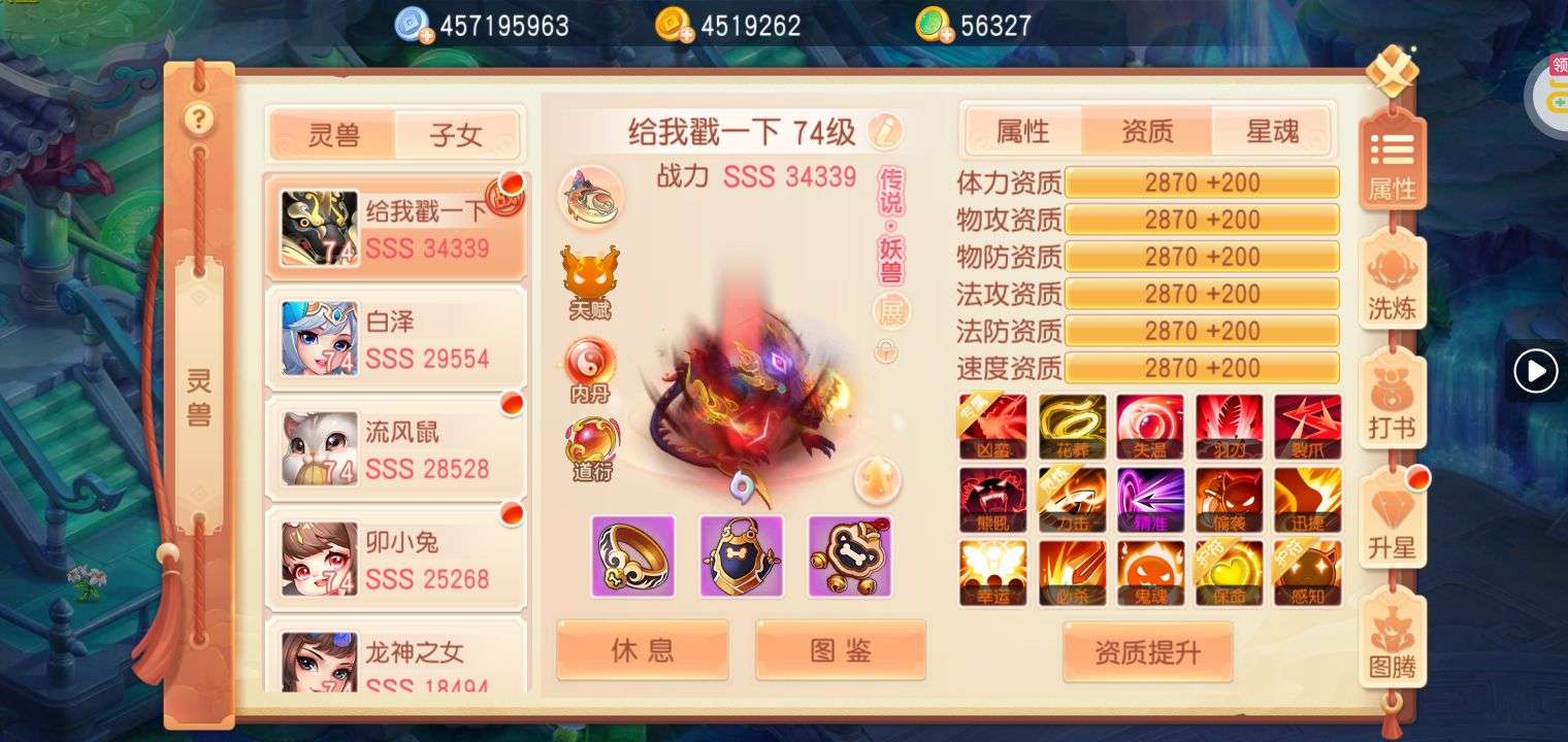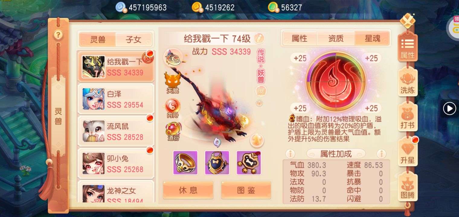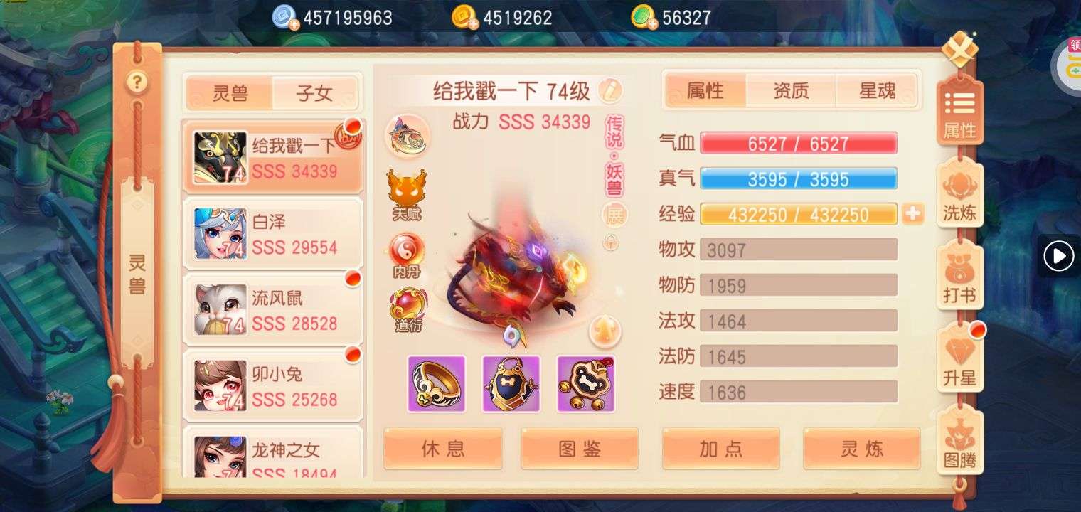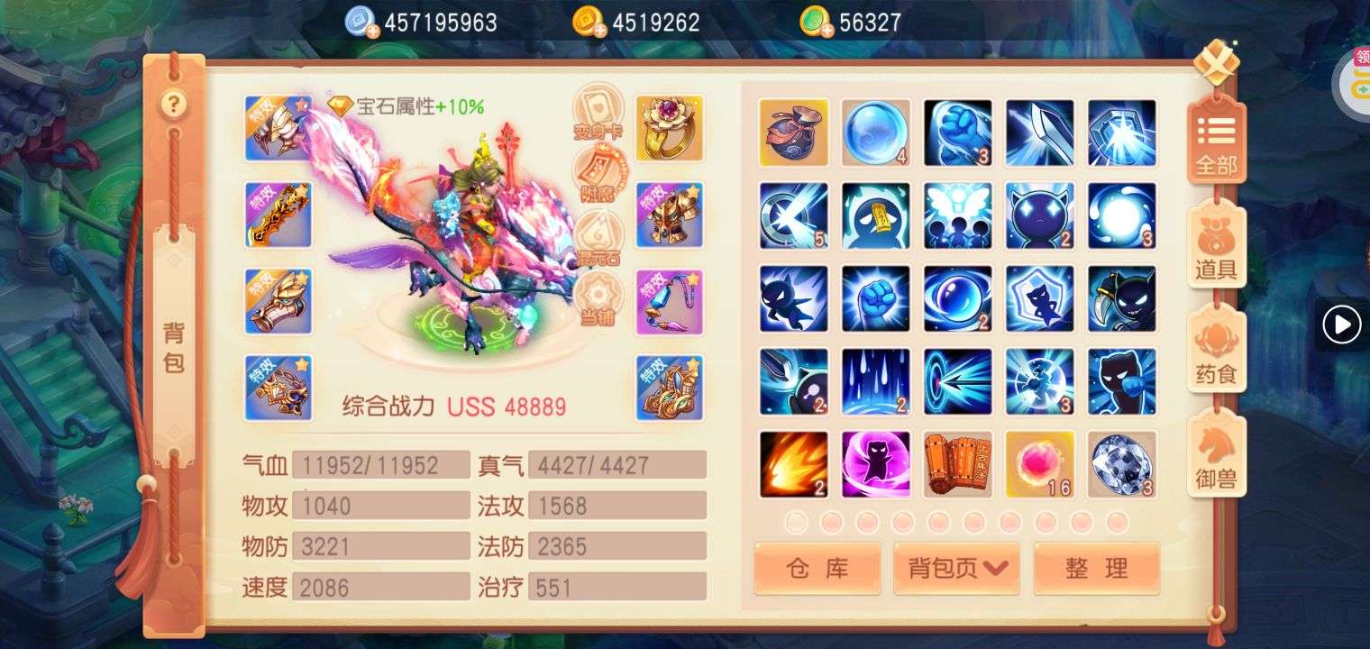 如图!装备全是灵兽增伤特效,其他仓库基本都是满的,各种资源都有……