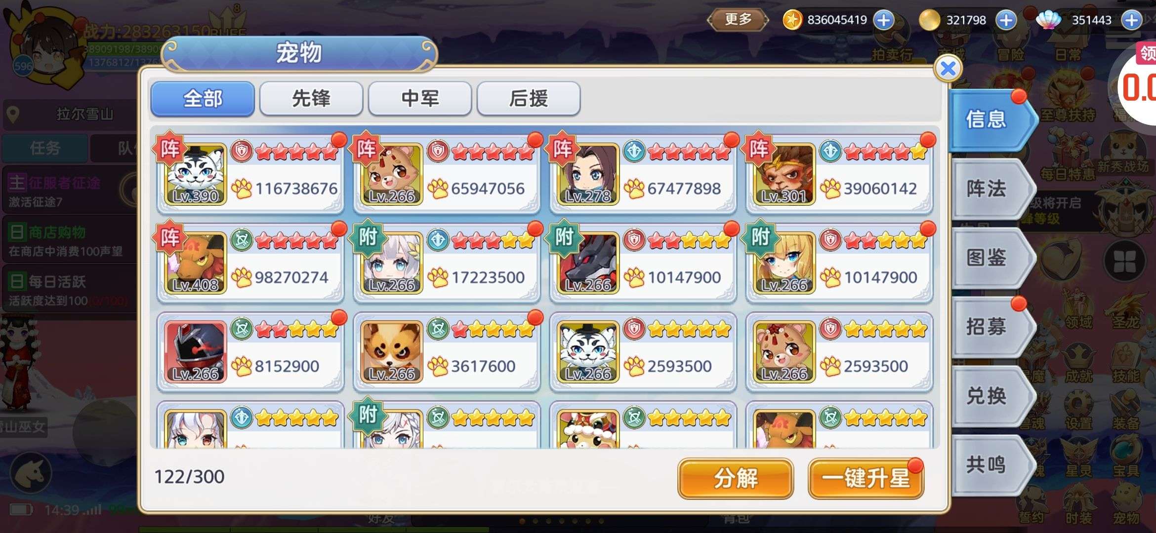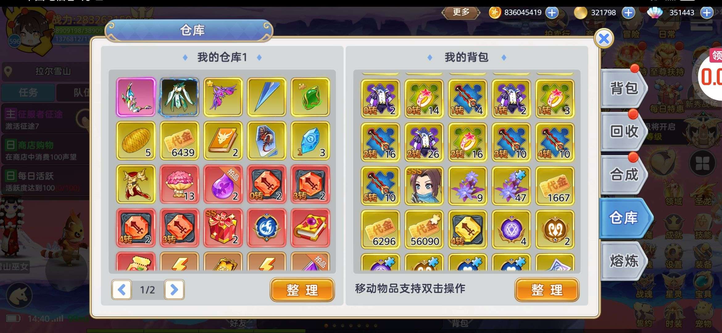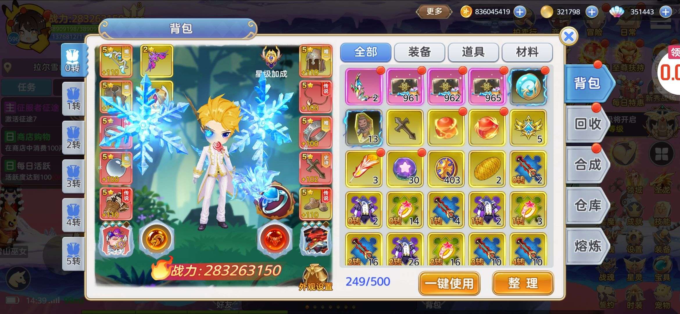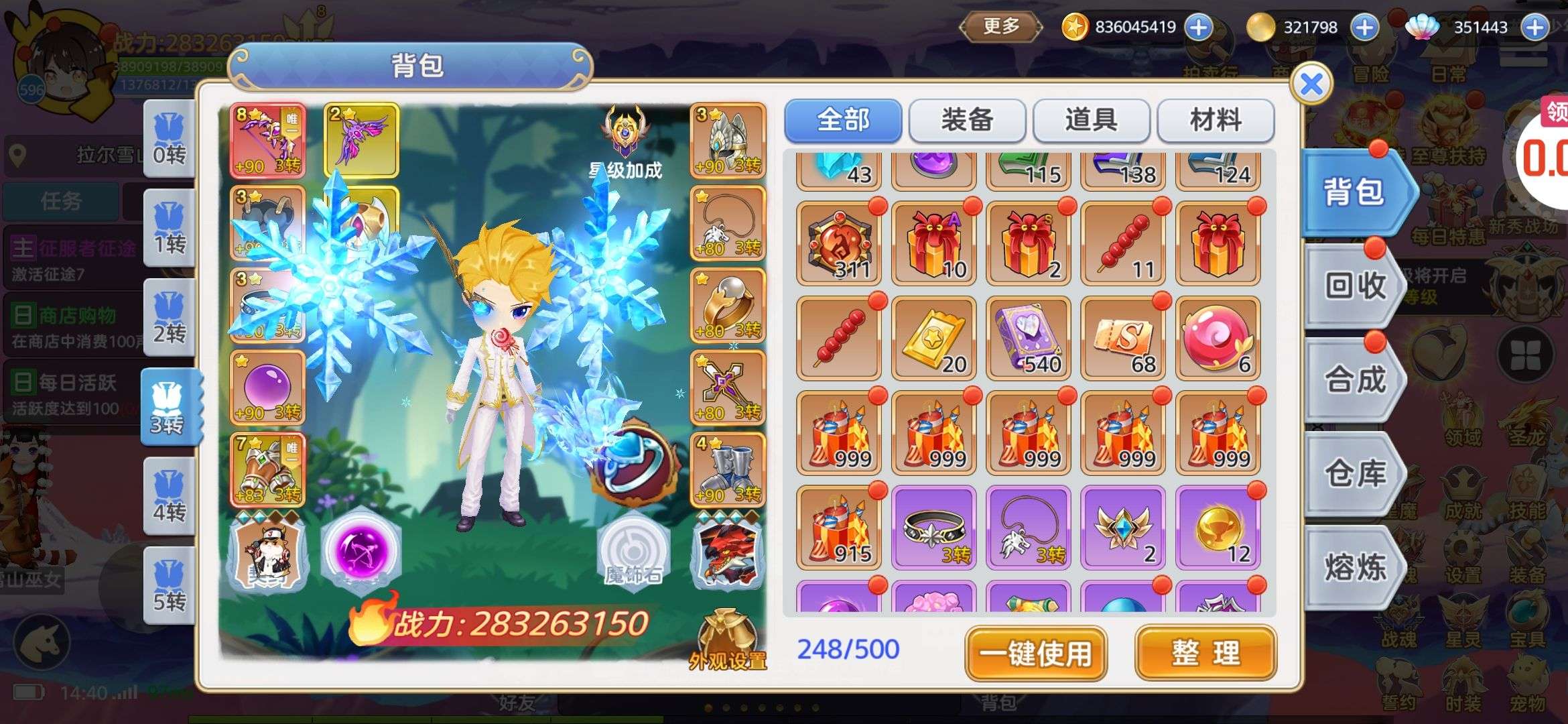 2.8亿战力,背包里还有69个1万的红包,还有不知道几组999的烟花礼包,宠物也很厉害,有两个神器。还有买宠物的卷子,有189个