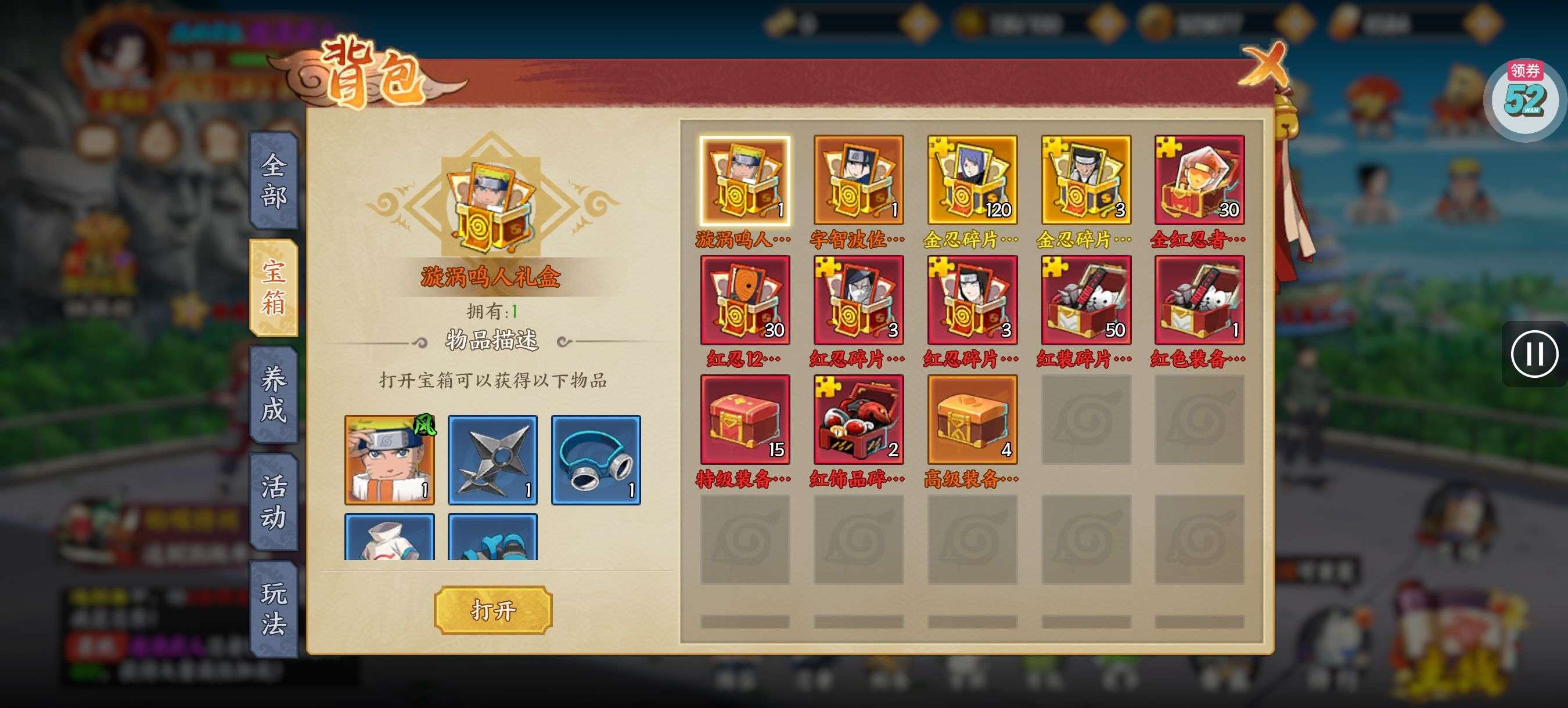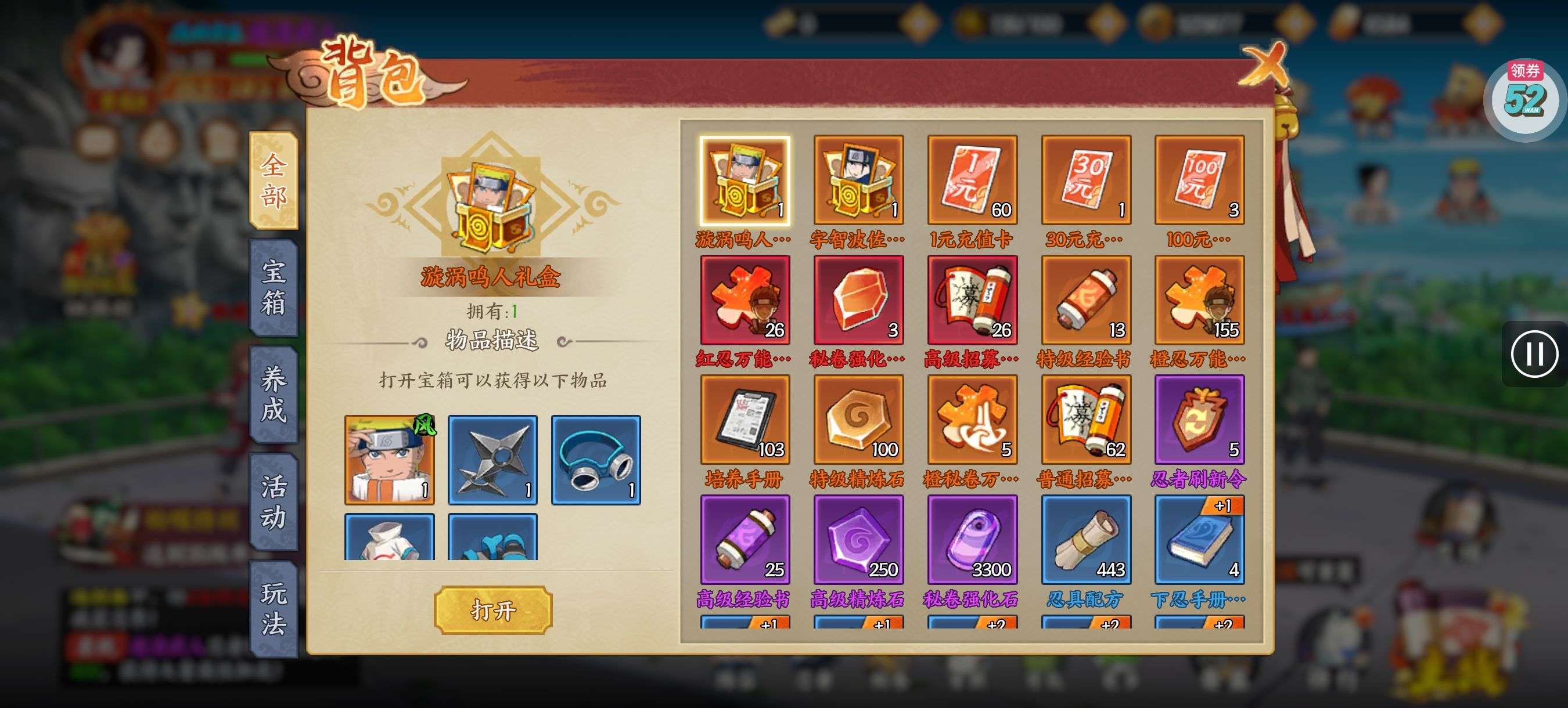 进阶丹*200,铜钱*100000,查克拉*100000(每个账号限领一次)