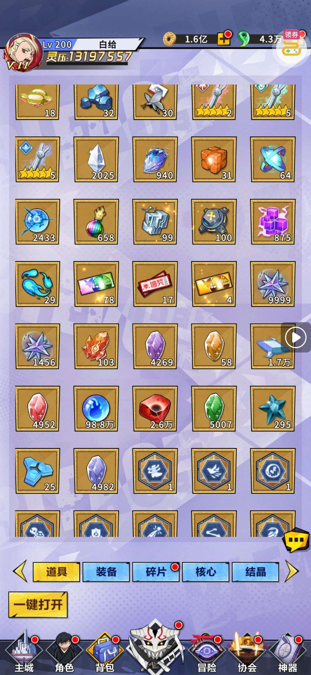 魂晶*888,魂师召唤券*10,武魂水晶*5(每个账号限领一次)