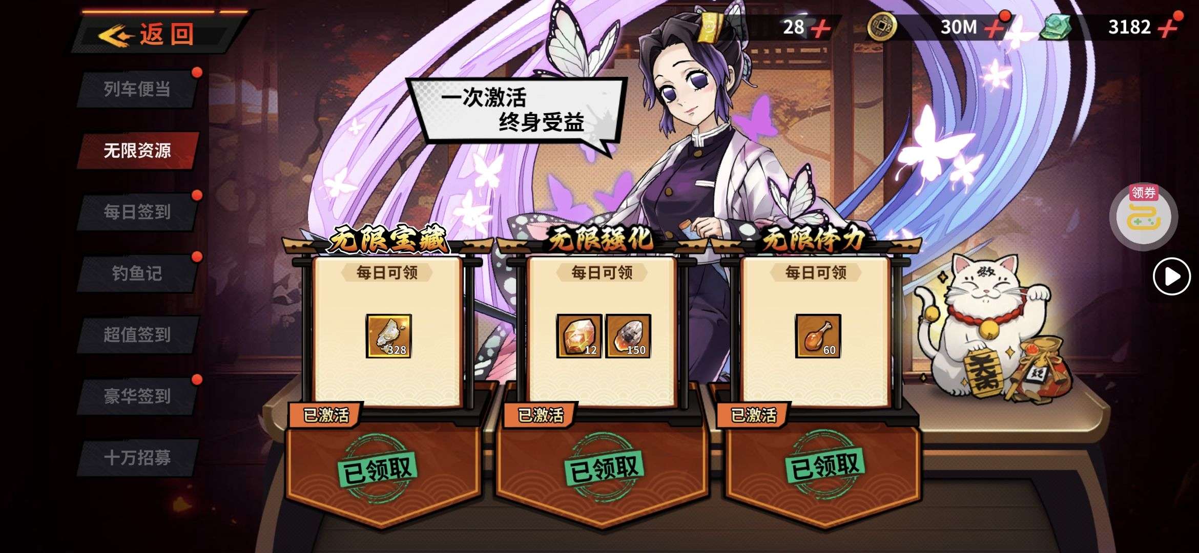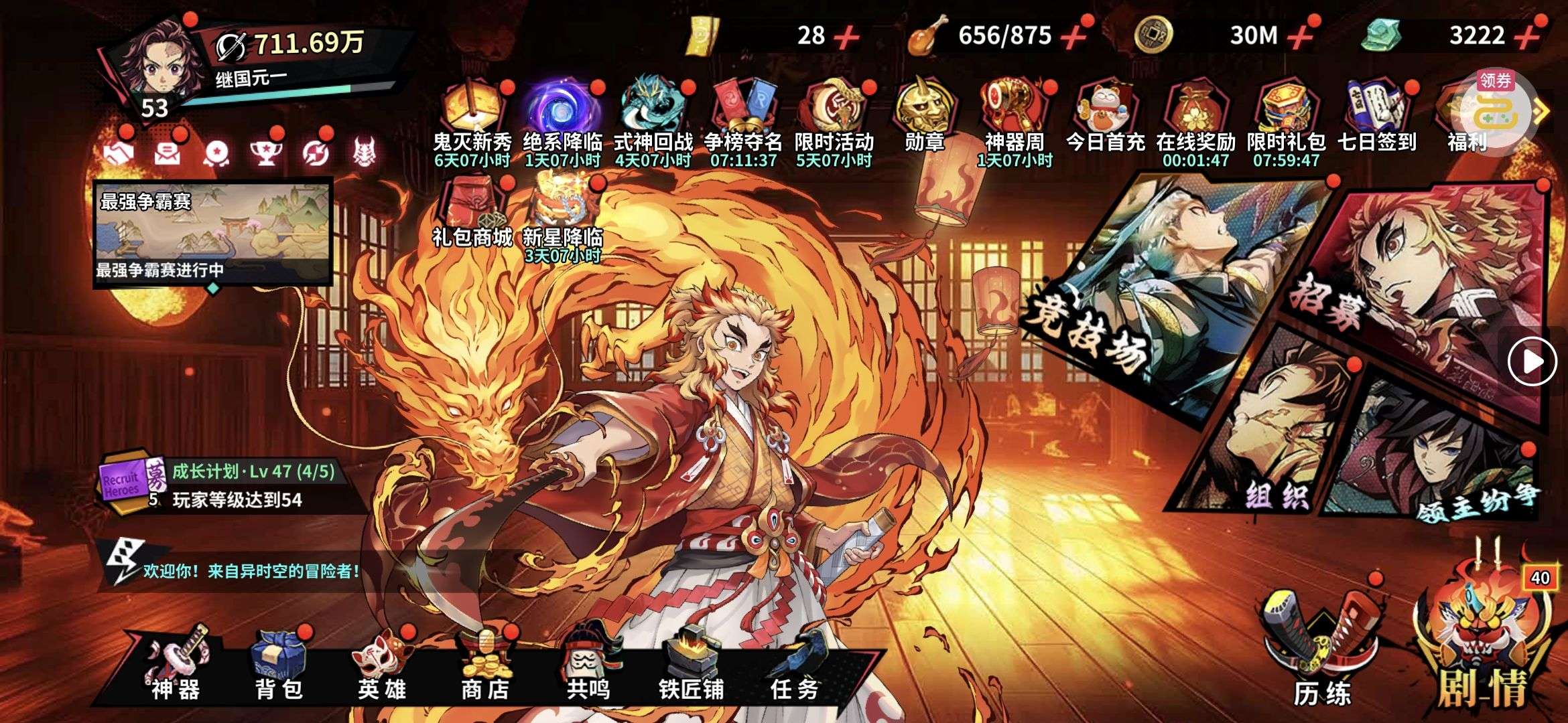 夺宝券*1、比武令*1、5星随机将魂*10(每个账号限领一次)