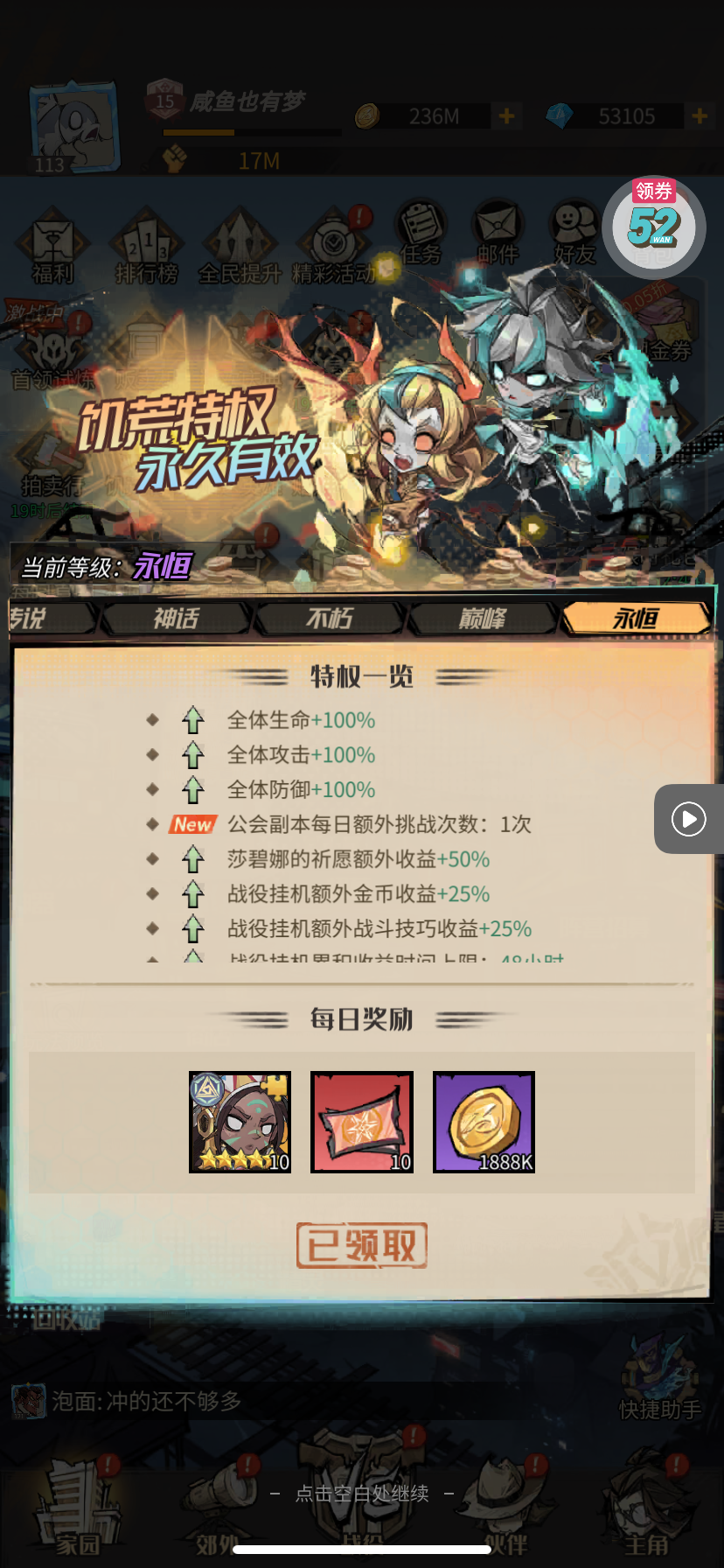 强化药剂*200、钻石招募币*20、金币*50W(每个账号限领一次)