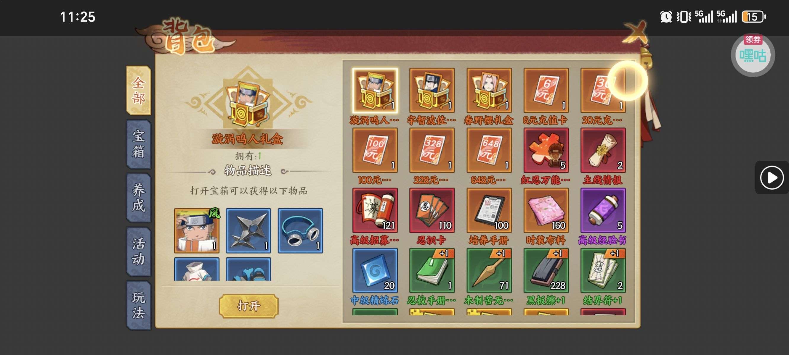 进阶丹*200,铜钱*100000,查克拉*100000(每个账号限领一次)