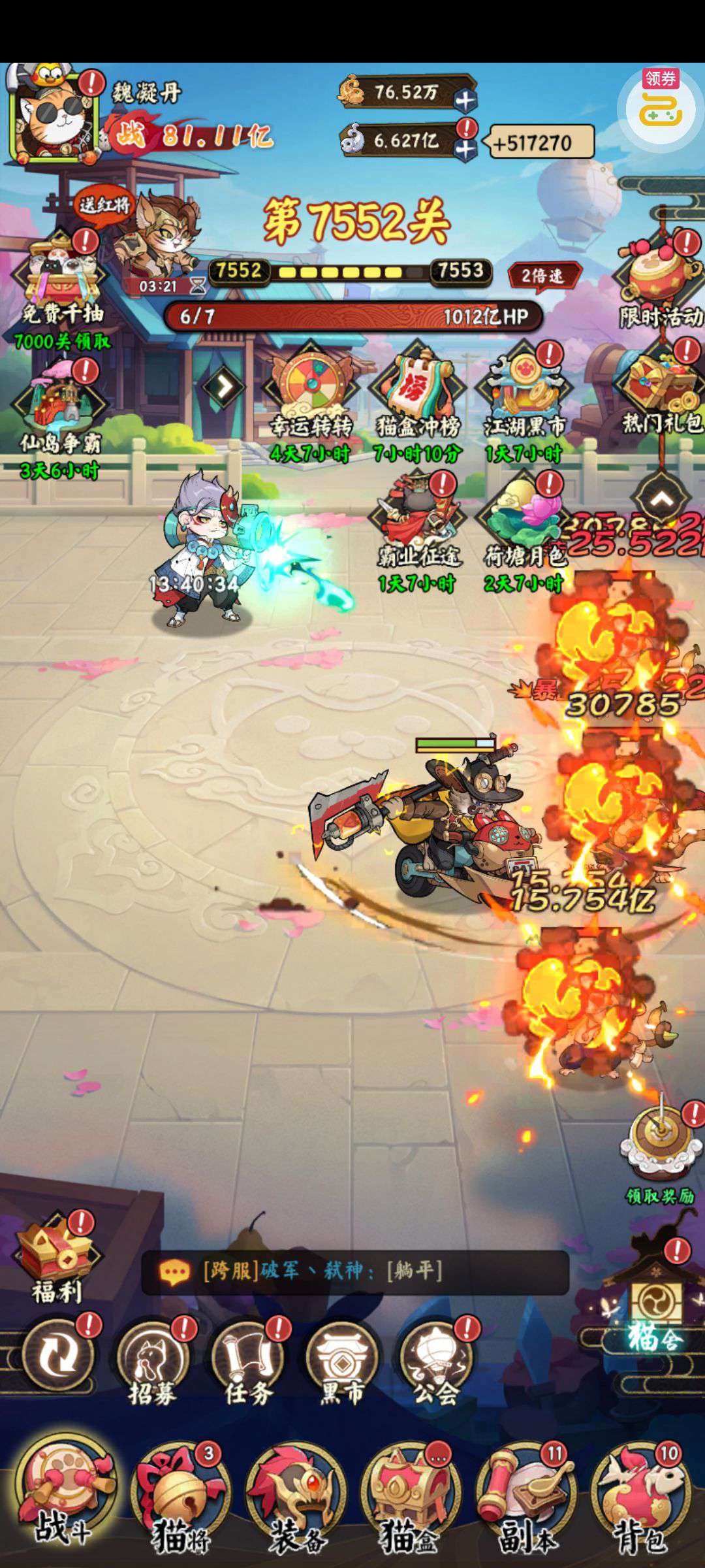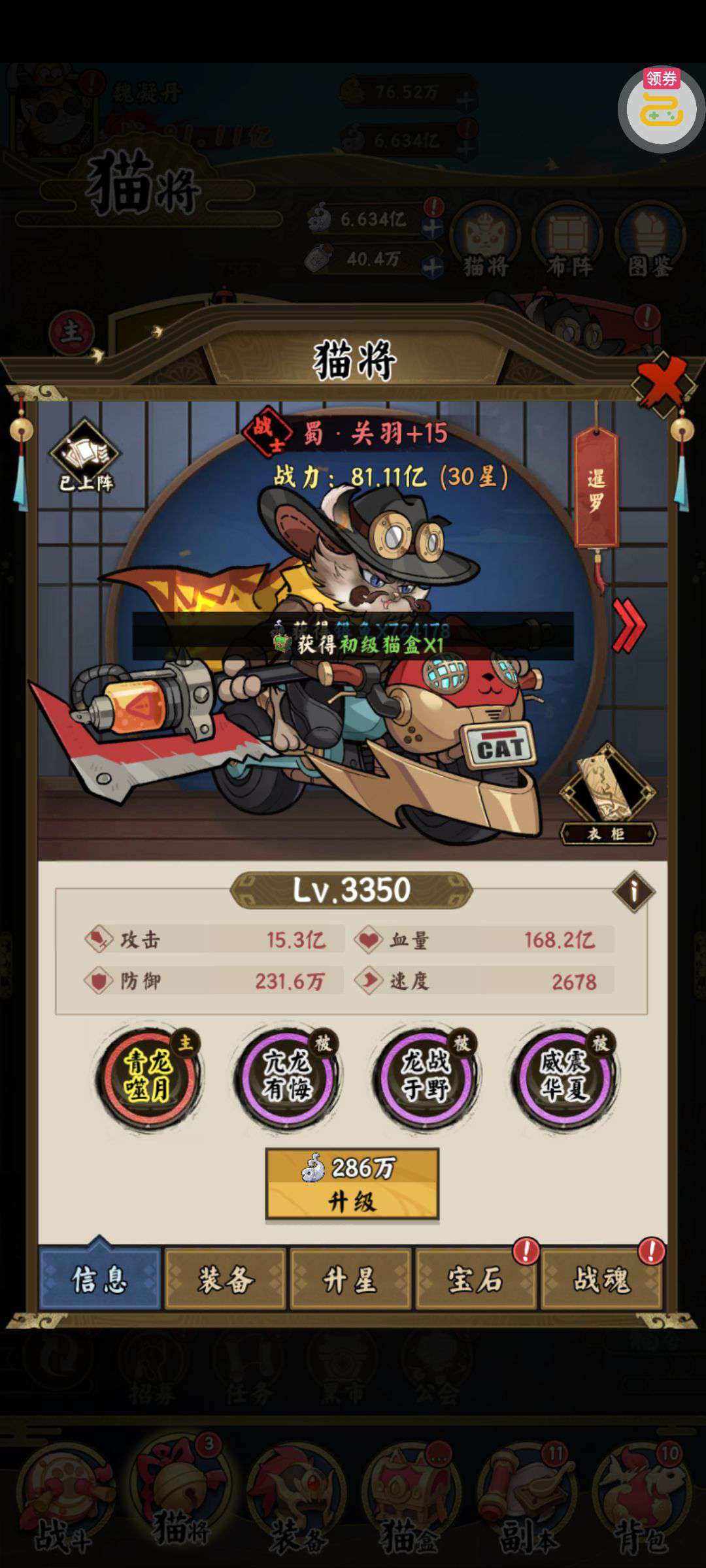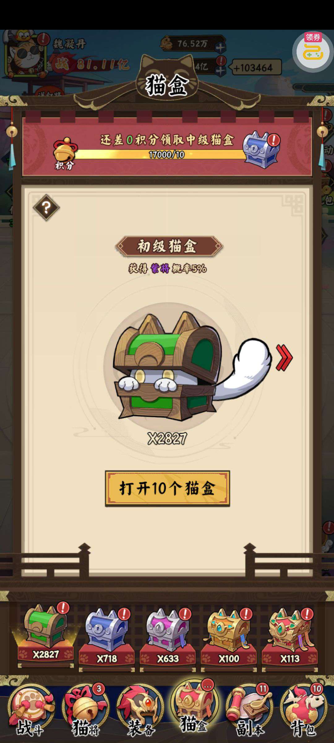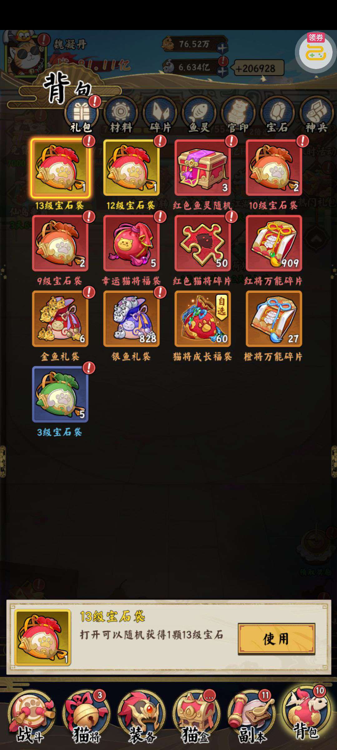 夺宝券*1、比武令*1、5星随机将魂*10(每个账号限领一次)