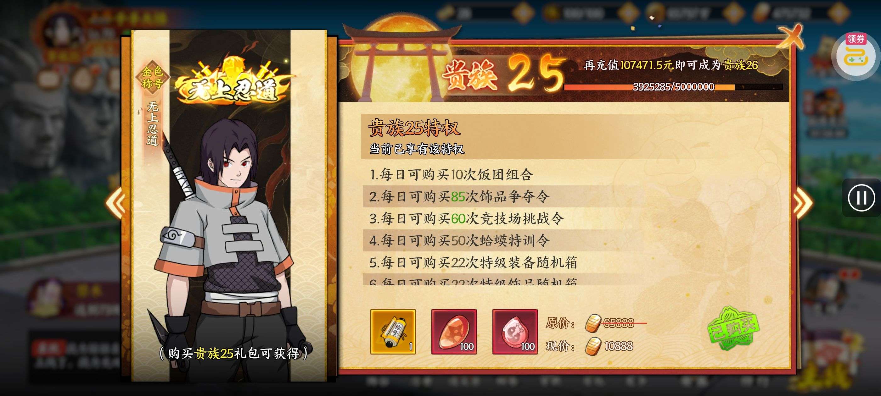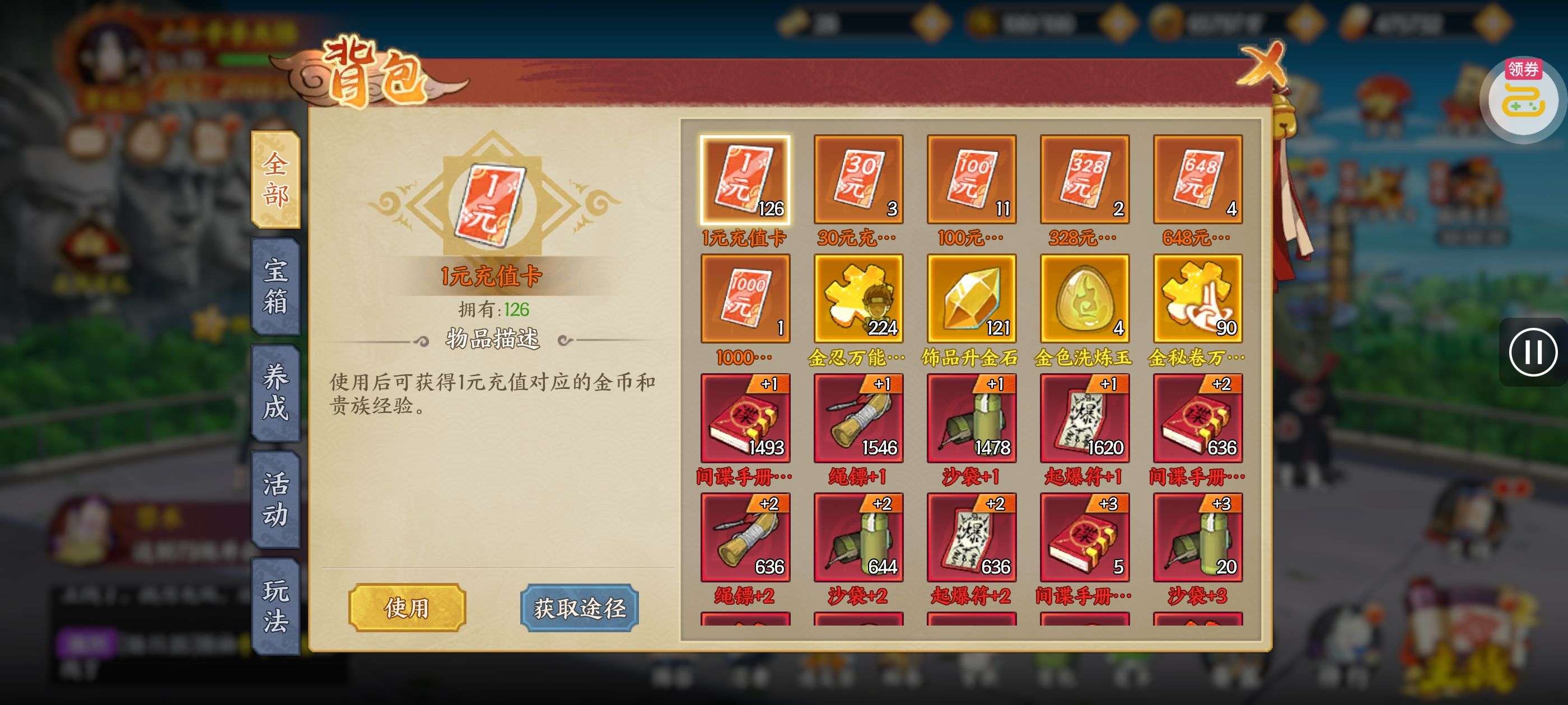 进阶丹*200,铜钱*100000,查克拉*100000(每个账号限领一次)