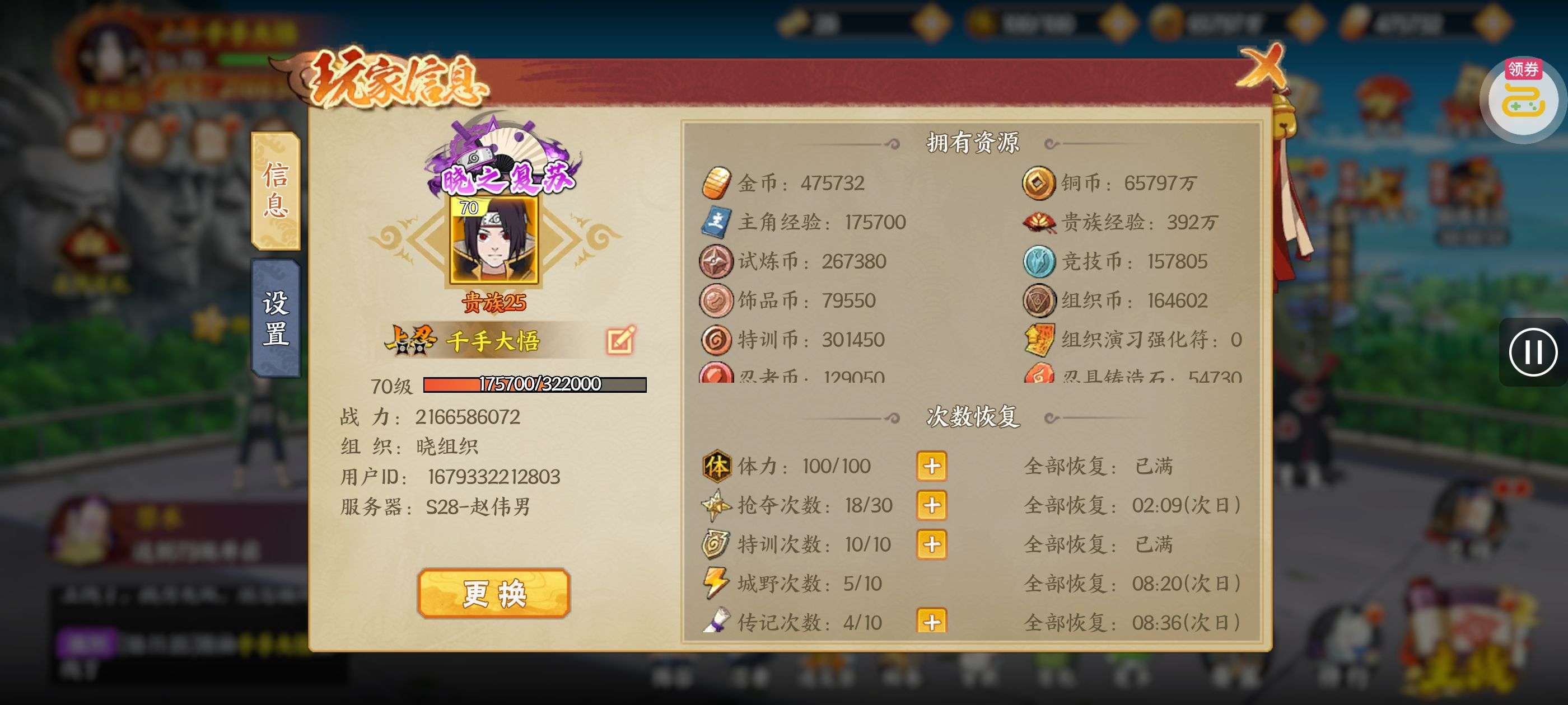 该号装备,等级,组织领袖,升级材料已齐全。 该号战力,在区服内数一数二。 该号已被我冠名。