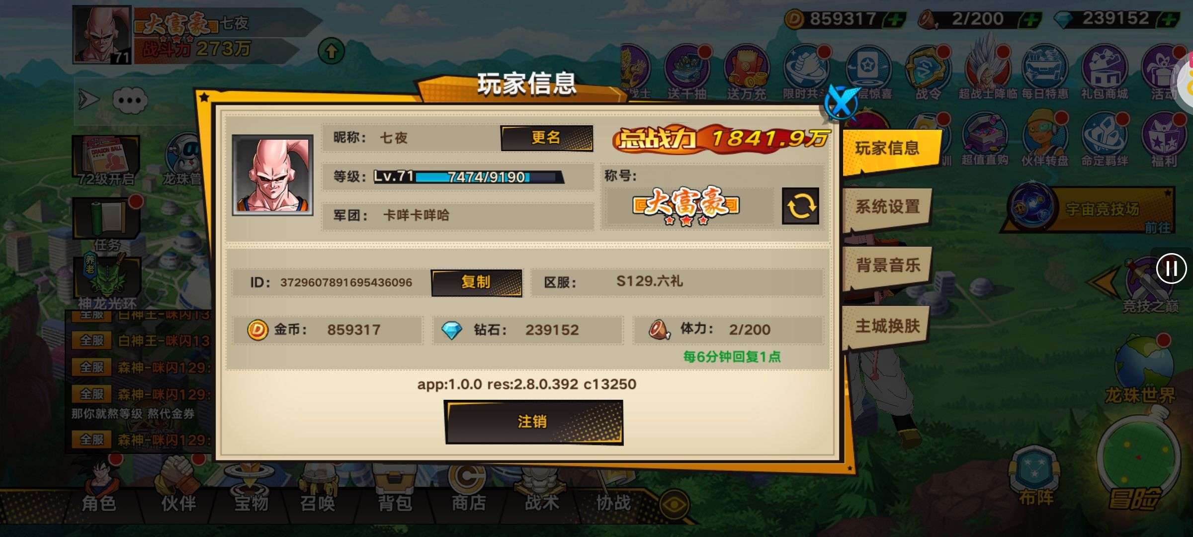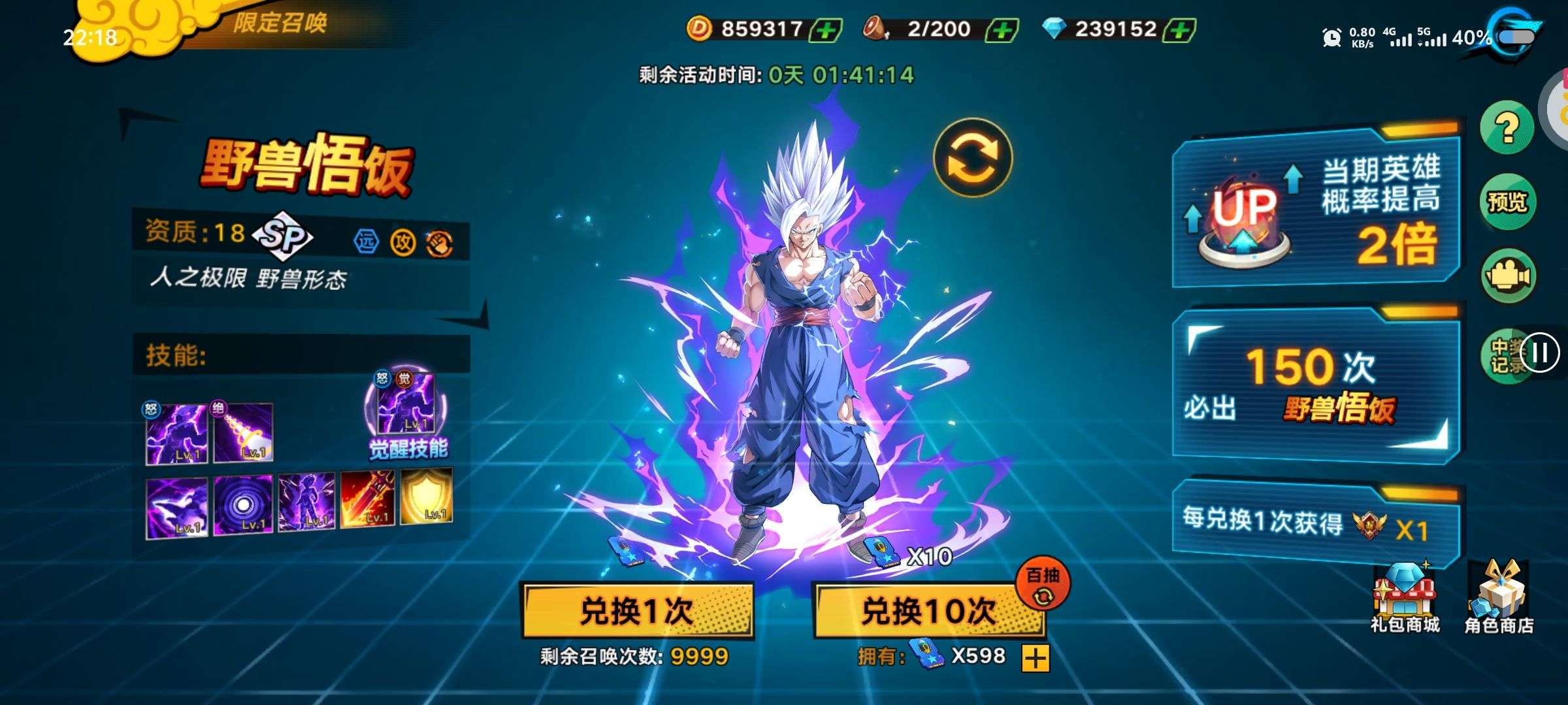 号内有: 金币:859317 钻石:239152 代金券:4384 还有598抽sp角色