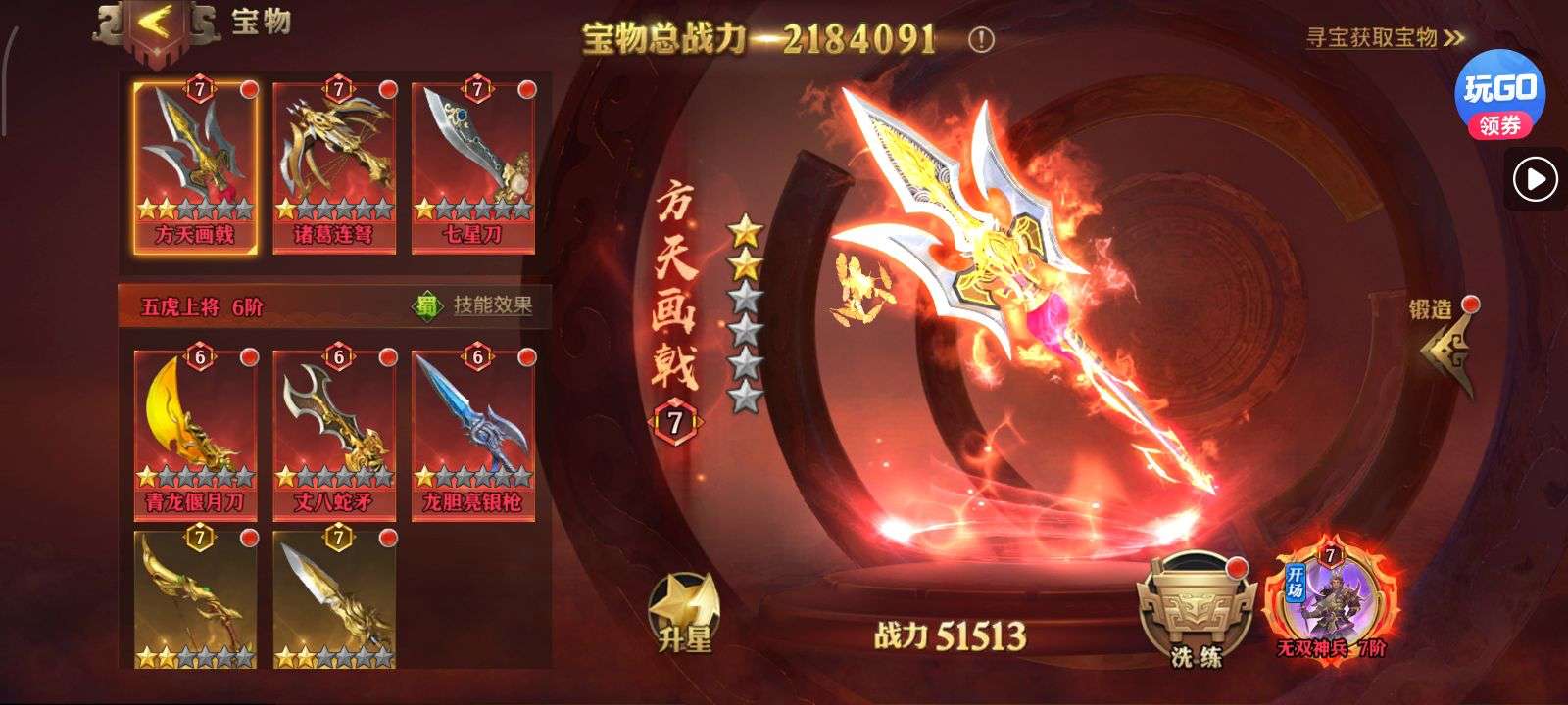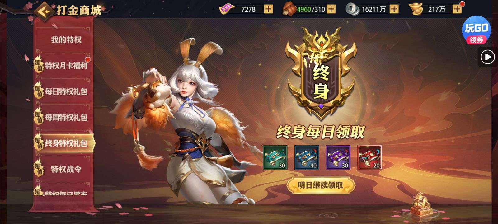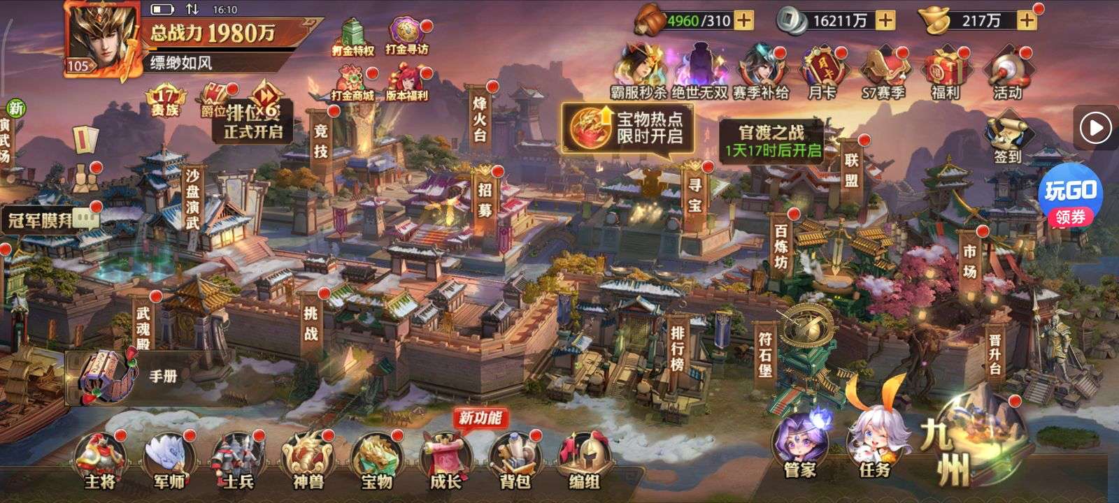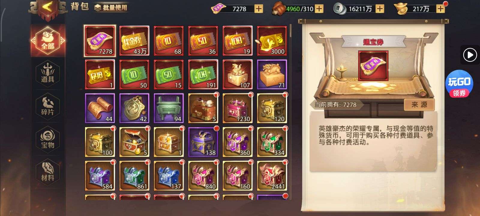 夺宝券*1、比武令*1、5星随机将魂*10(每个账号限领一次)