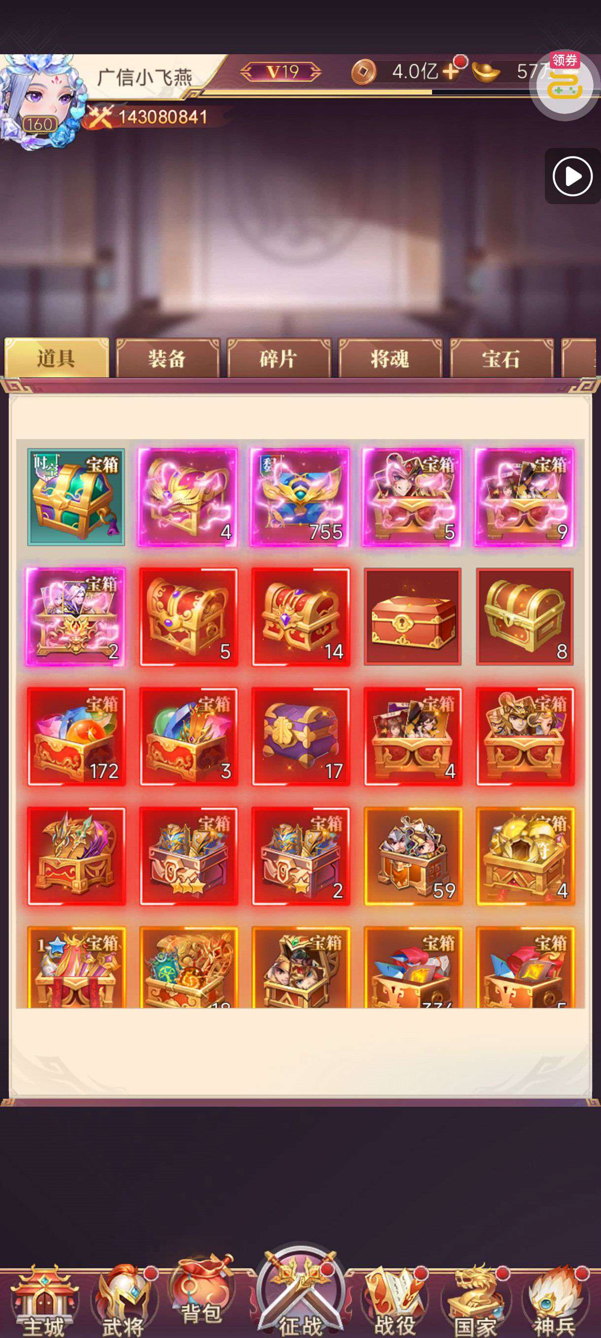 夺宝券*1、比武令*1、5星随机将魂*10(每个账号限领一次)