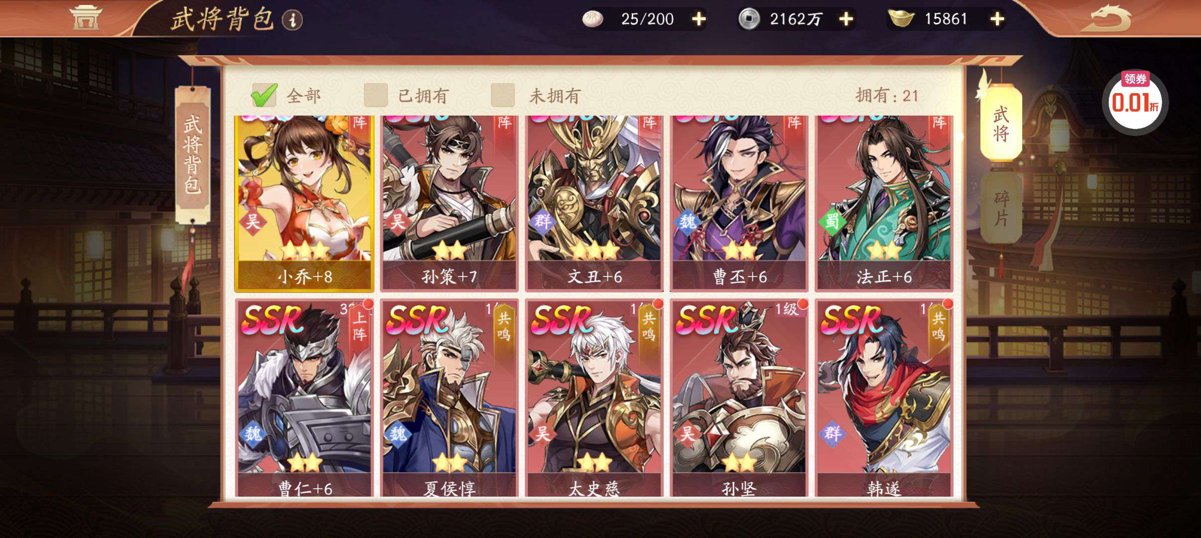 金装的碎片还有宝物的锻造石都还在好多资源都还没动黄忠马超都是满星的,红颜家个一星俩个二星一个四星的,那些能开的卡全都开完了