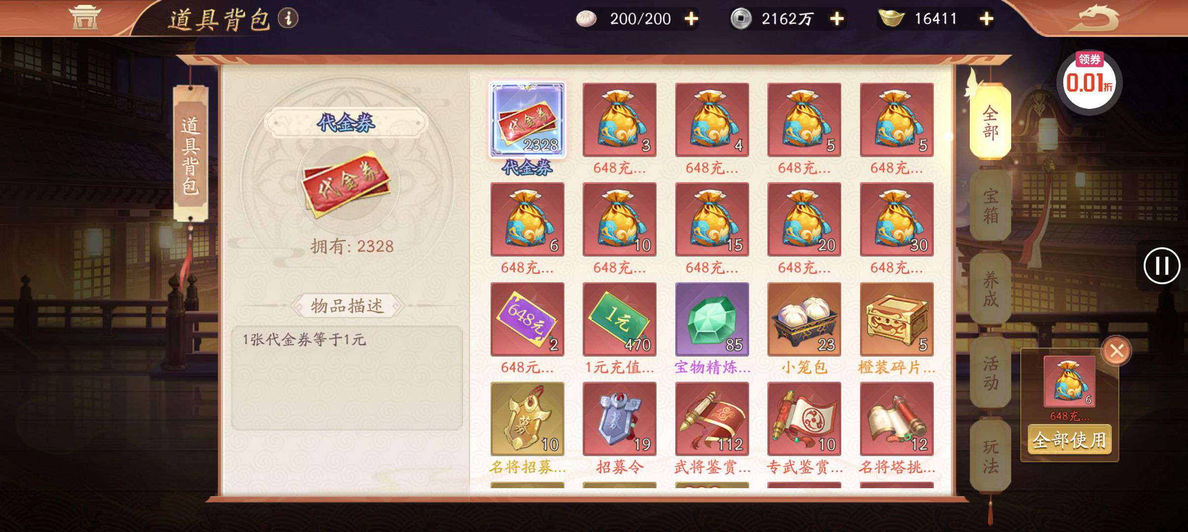 夺宝券*1、比武令*1、5星随机将魂*10(每个账号限领一次)