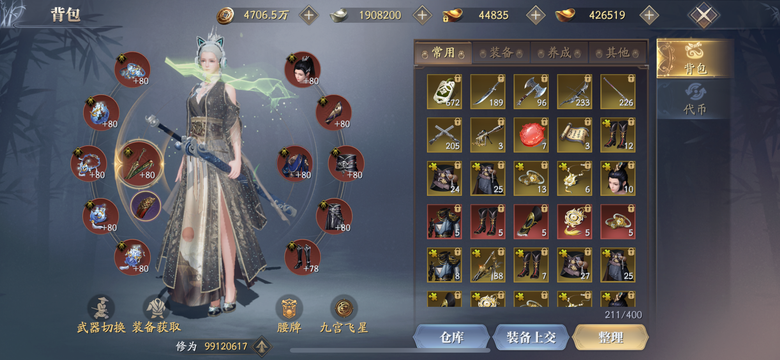 开服五天基本都在线打九宫材料,战力还有好多没弄,还有4千把伙伴钥匙,养老足够,余年值可换时装