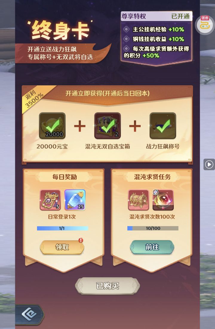 夺宝券*1、比武令*1、5星随机将魂*10(每个账号限领一次)