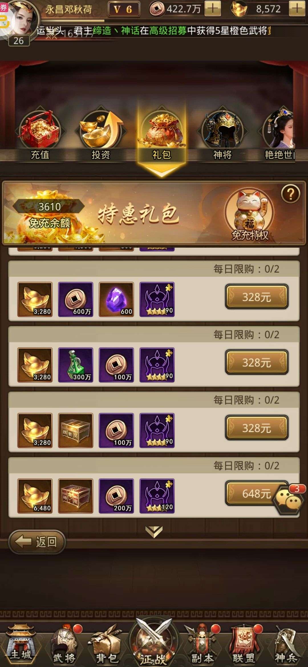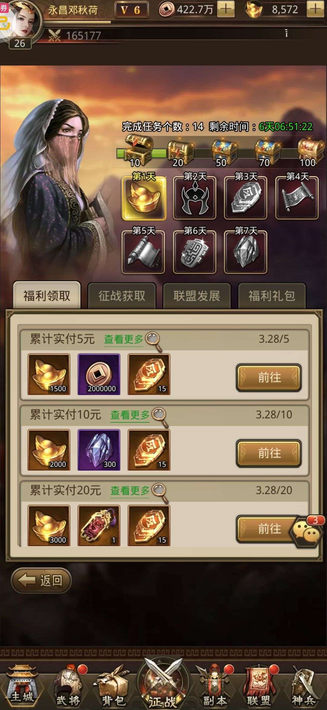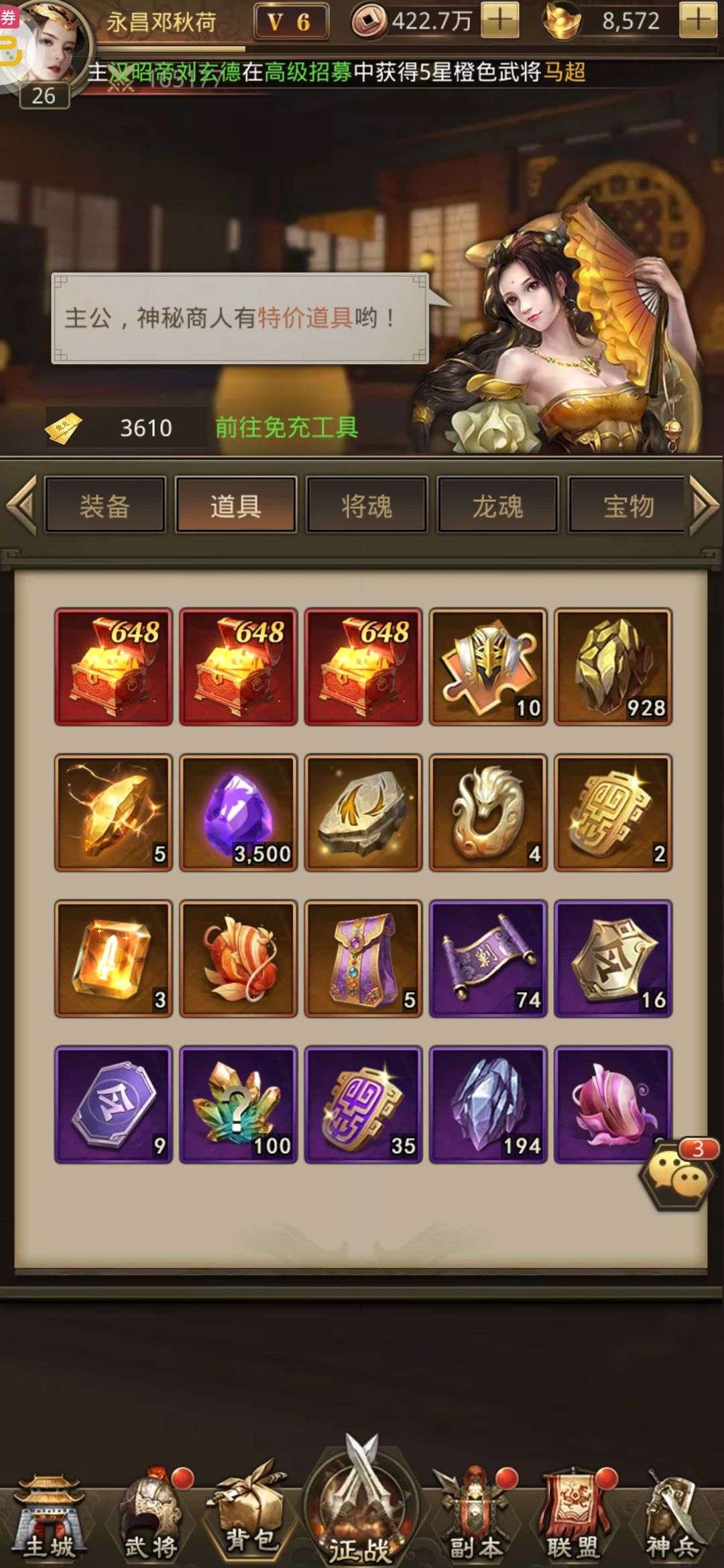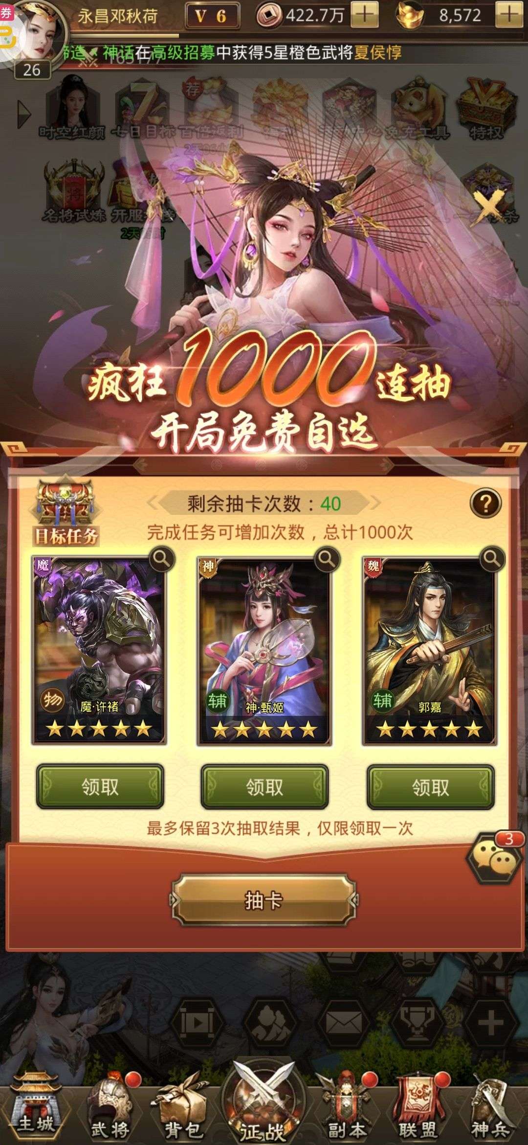 夺宝券*1、比武令*1、5星随机将魂*10(每个账号限领一次)