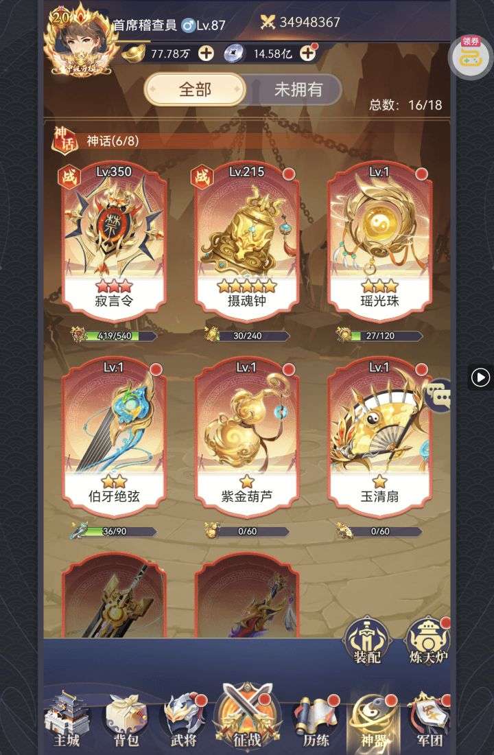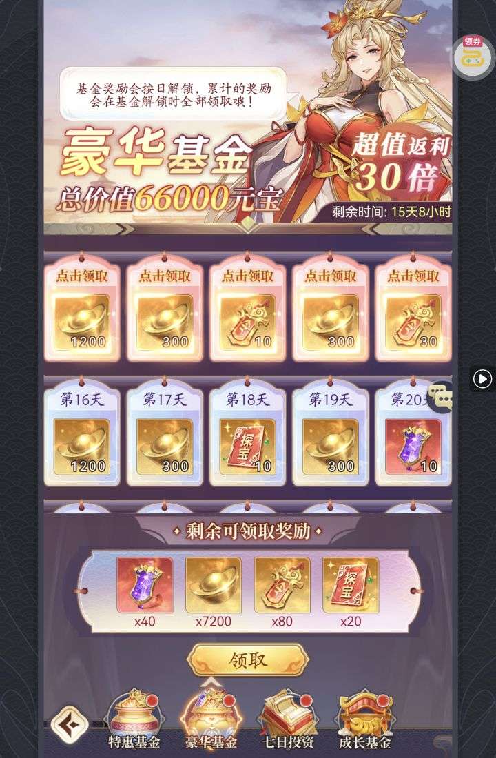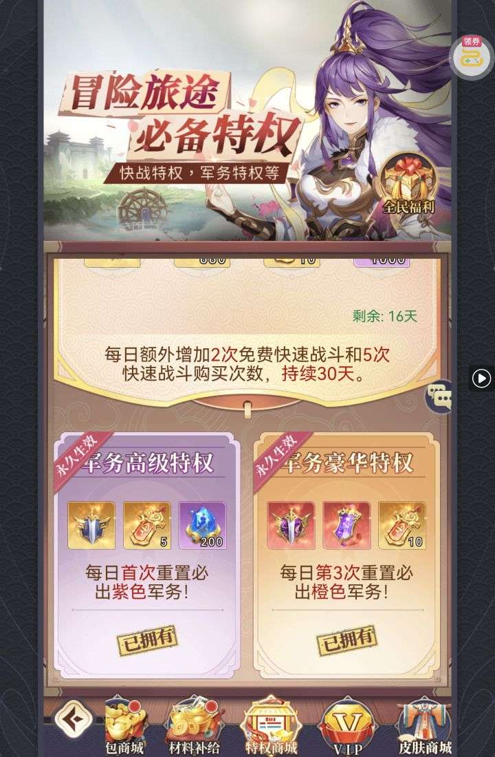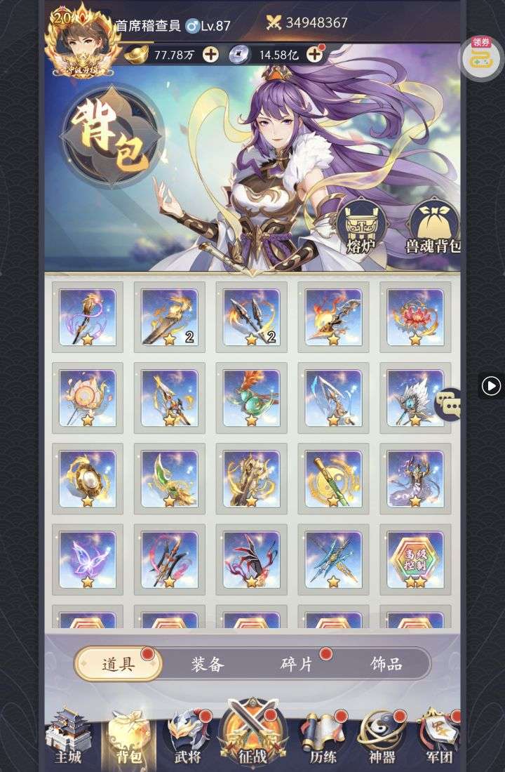 夺宝券*1、比武令*1、5星随机将魂*10(每个账号限领一次)