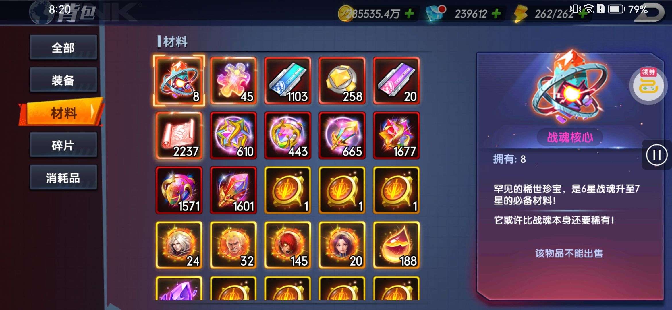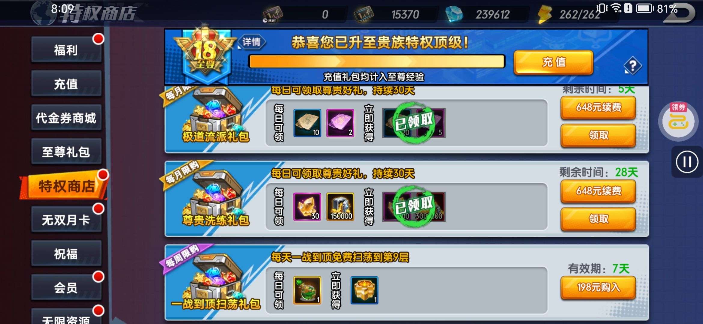 特权基本都开了,有15000的代金券,还有20万充值卡(200万钻石),八神庵已经升SP,SP主要有伊丽莎白和神武,1000多的神将招募券和2000多的超级神将招募券,想玩的神将可以自己招募