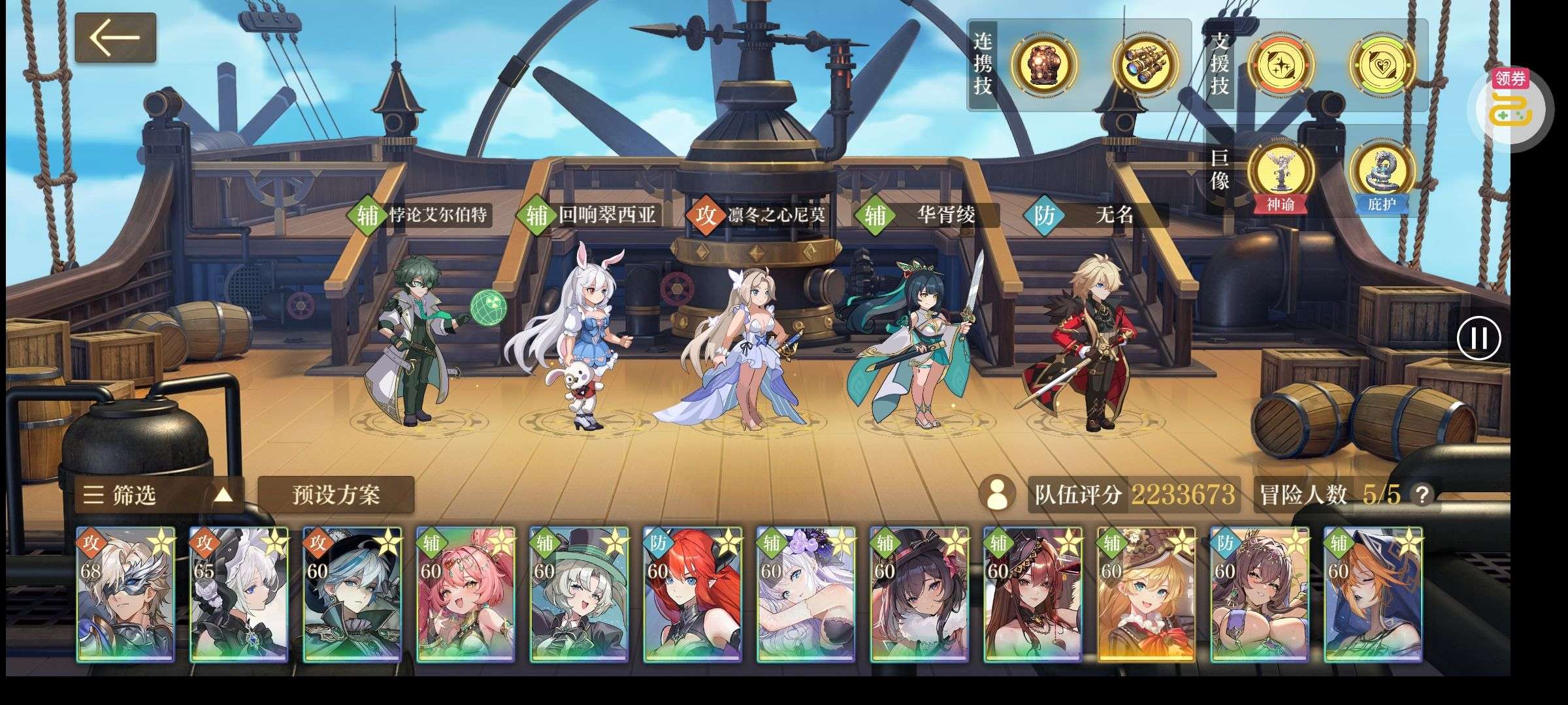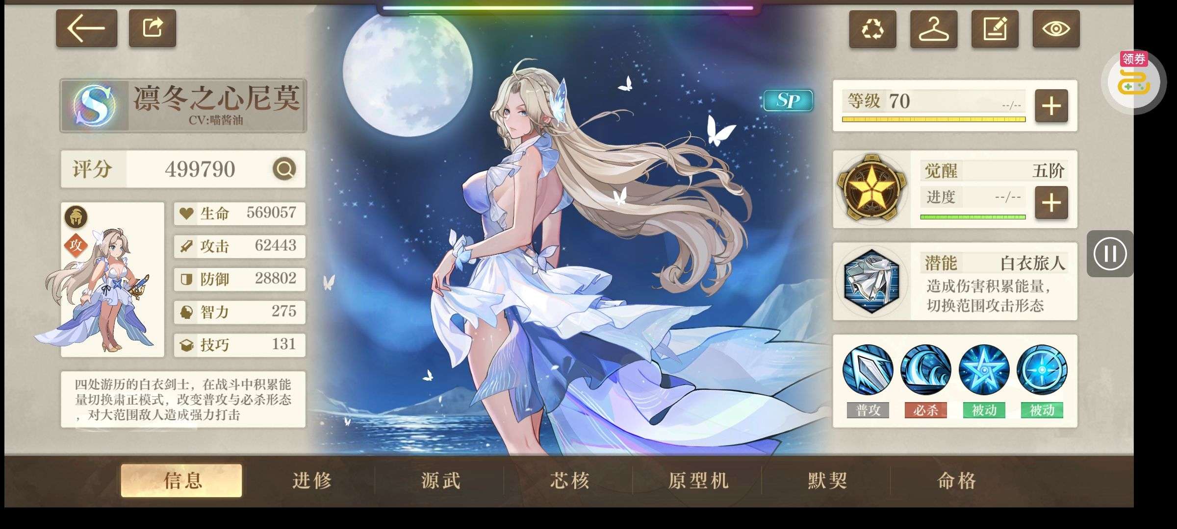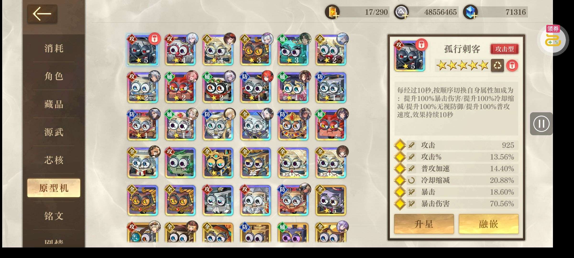 这个账号内用金币充了二十五有余,不是用现金,所以没有显示, 打关卡已经打到极限,准备养成攻速队,资源如图,赠以下攻略, 目前已经有了基础配队,后期极夜可以换成月咏或者sp尼莫,然后将防御位换成无名或者星纭,抽数可以囤着后面抽,养月咏则最好要带上小丑原型机。当然,可以根据自己需要养成。