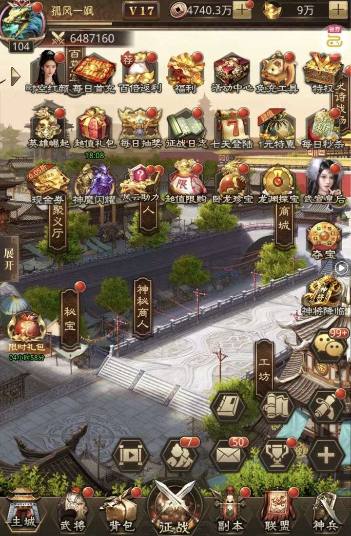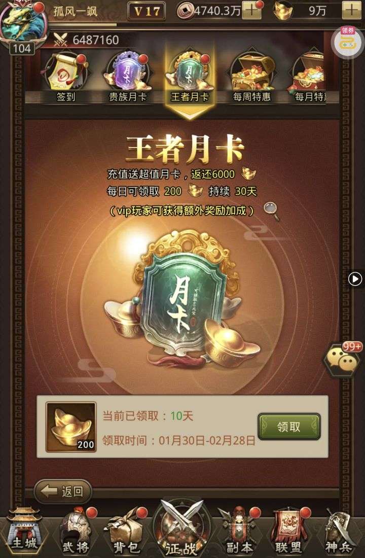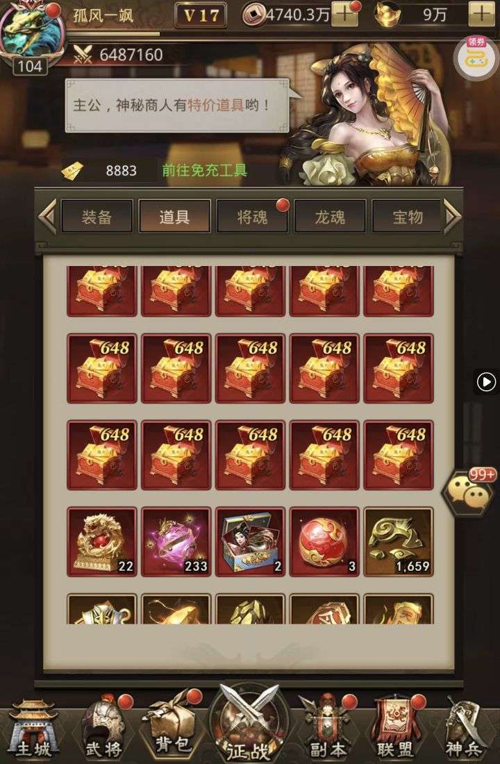 夺宝券*1、比武令*1、5星随机将魂*10(每个账号限领一次)