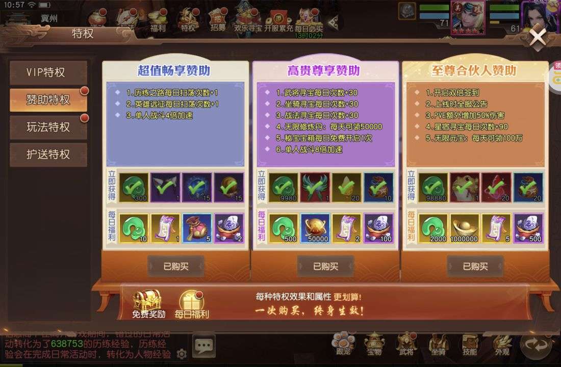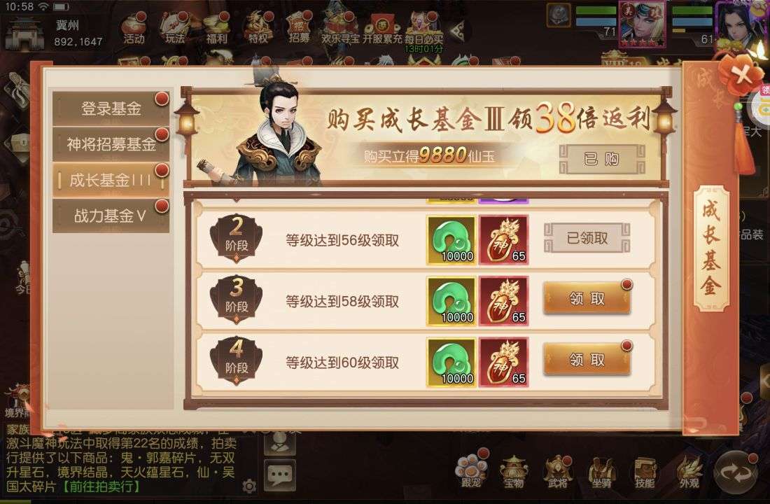 夺宝券*1、比武令*1、5星随机将魂*10(每个账号限领一次)