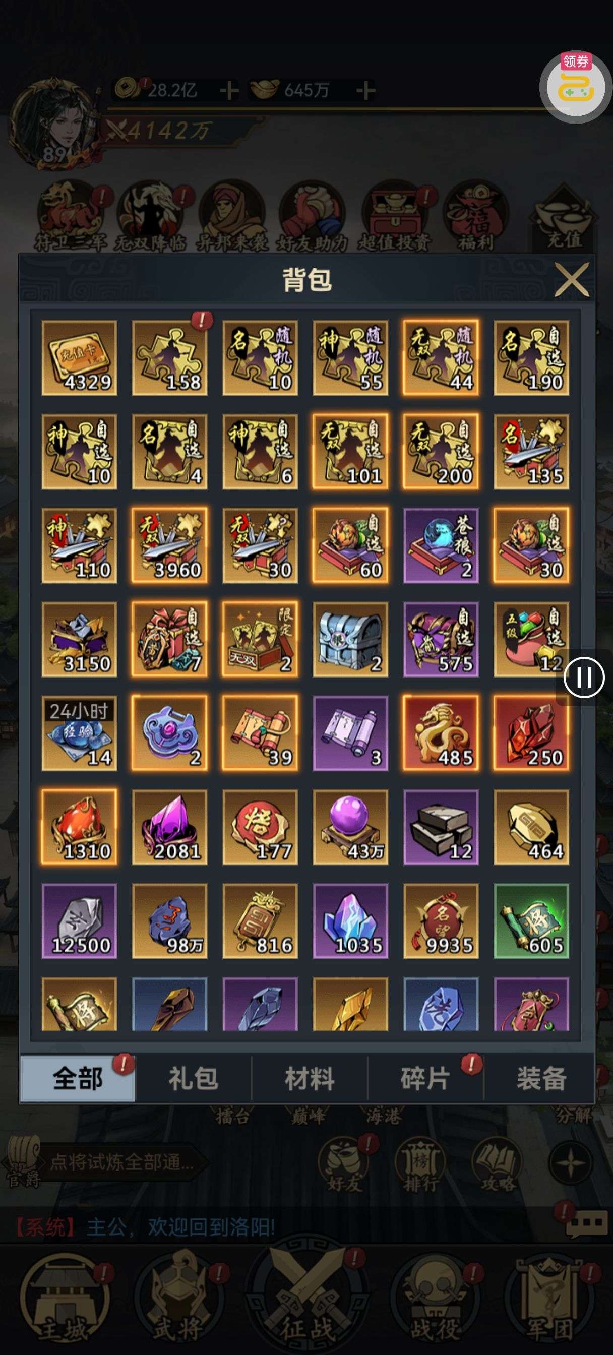 夺宝券*1、比武令*1、5星随机将魂*10(每个账号限领一次)