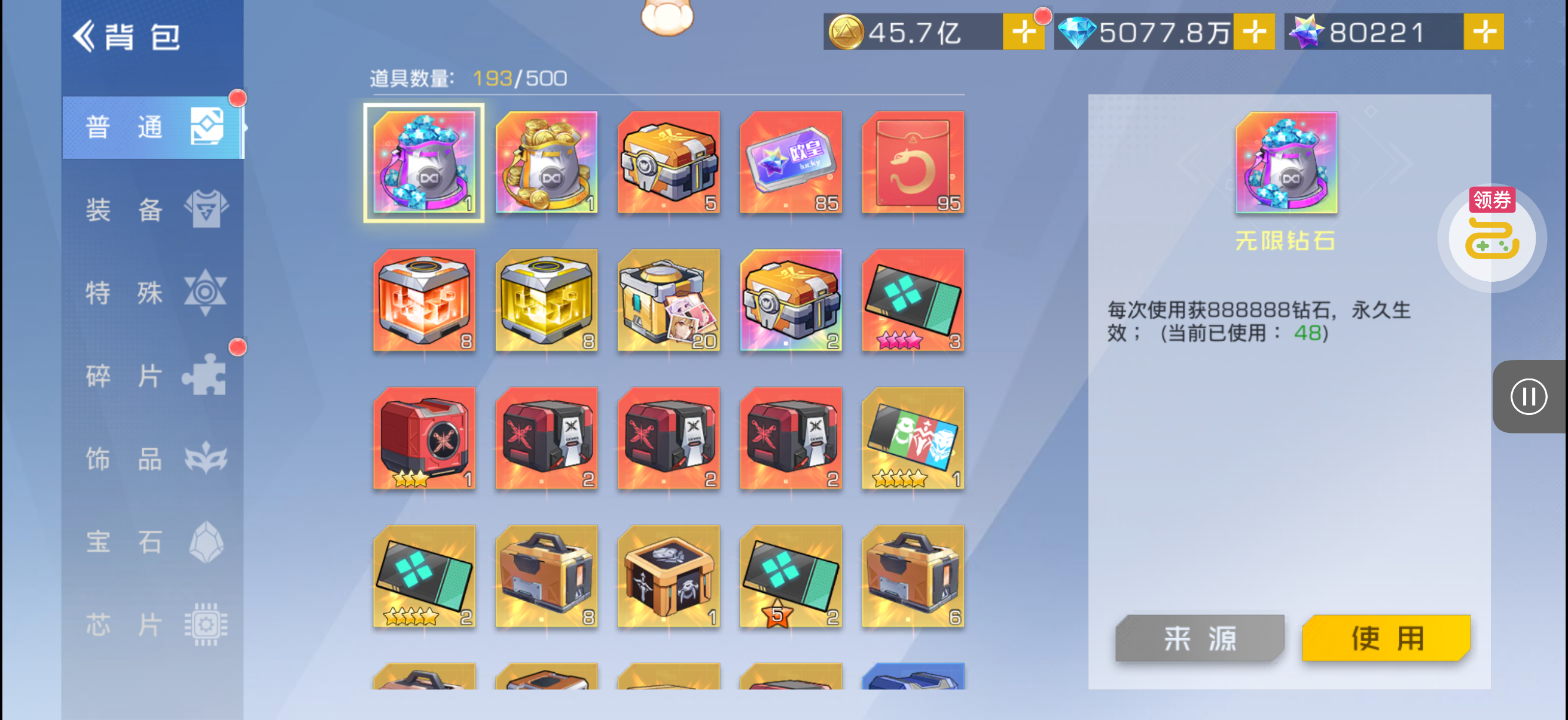 芯片熔炼石*1、离子探针*50、净化金属*50(每个账号限领一次)