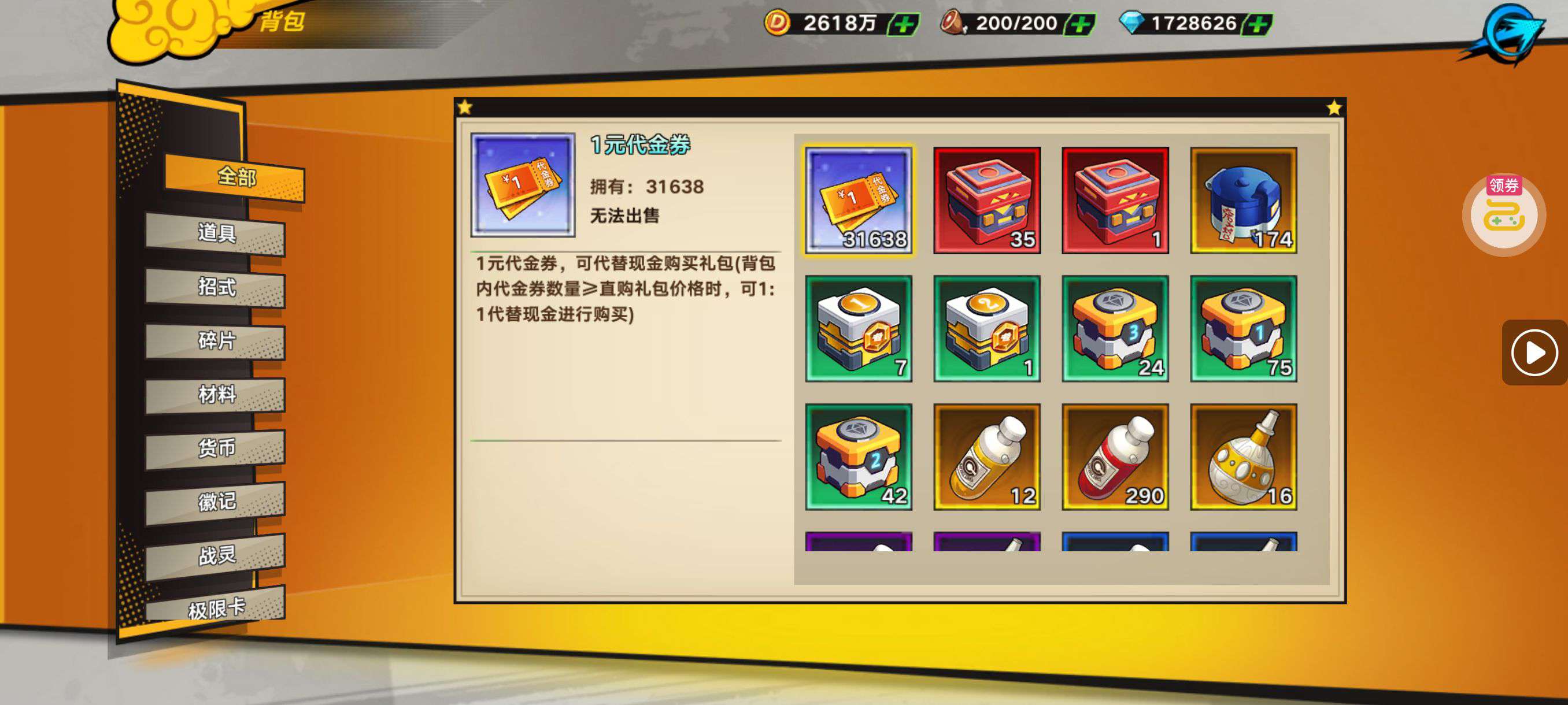 夺宝券*1、比武令*1、5星随机将魂*10(每个账号限领一次)