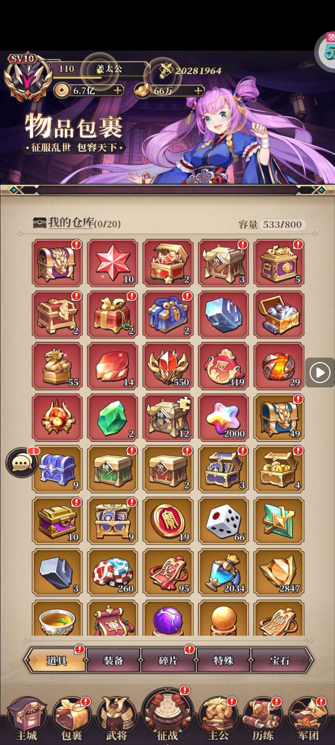 夺宝券*1、比武令*1、5星随机将魂*10(每个账号限领一次)