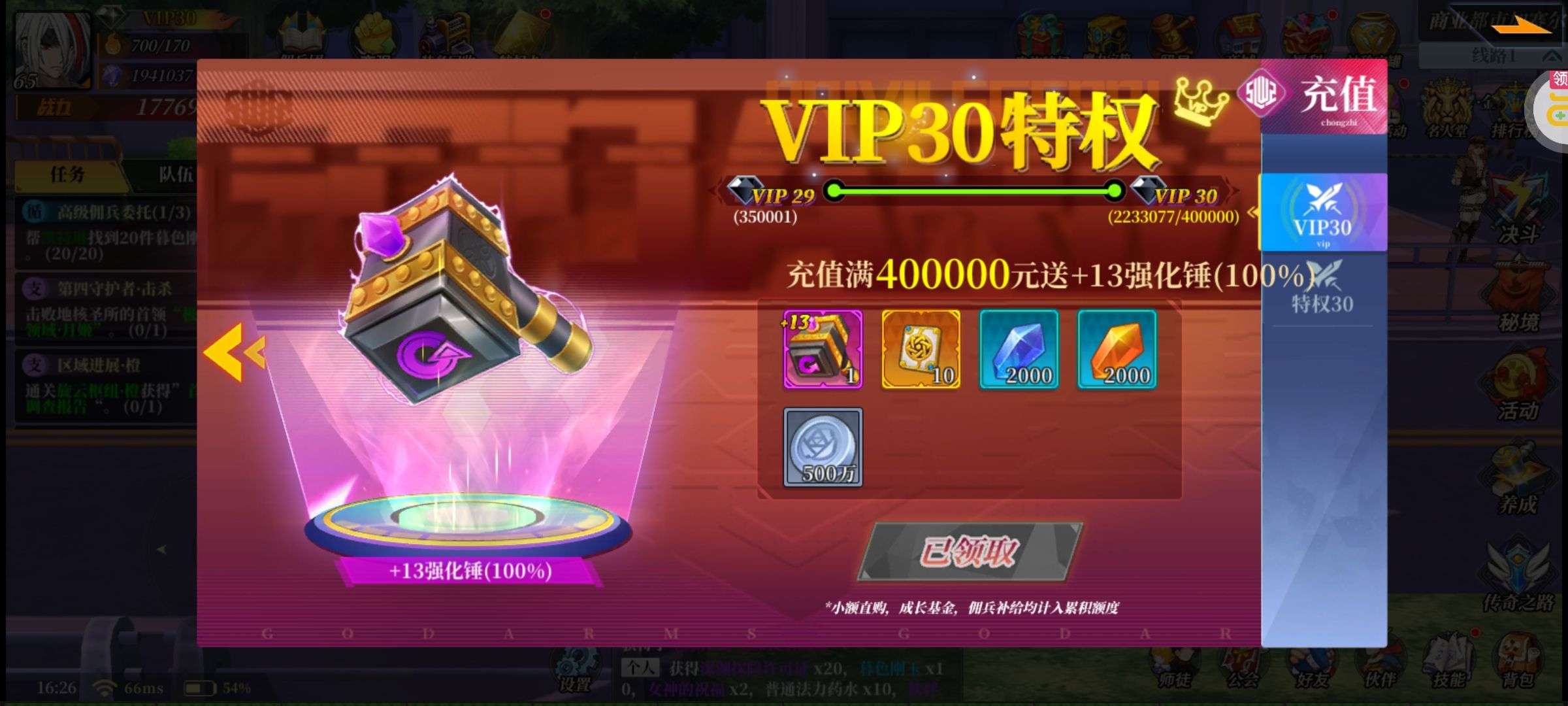 强化药剂*200、钻石招募币*20、金币*50W(每个账号限领一次)