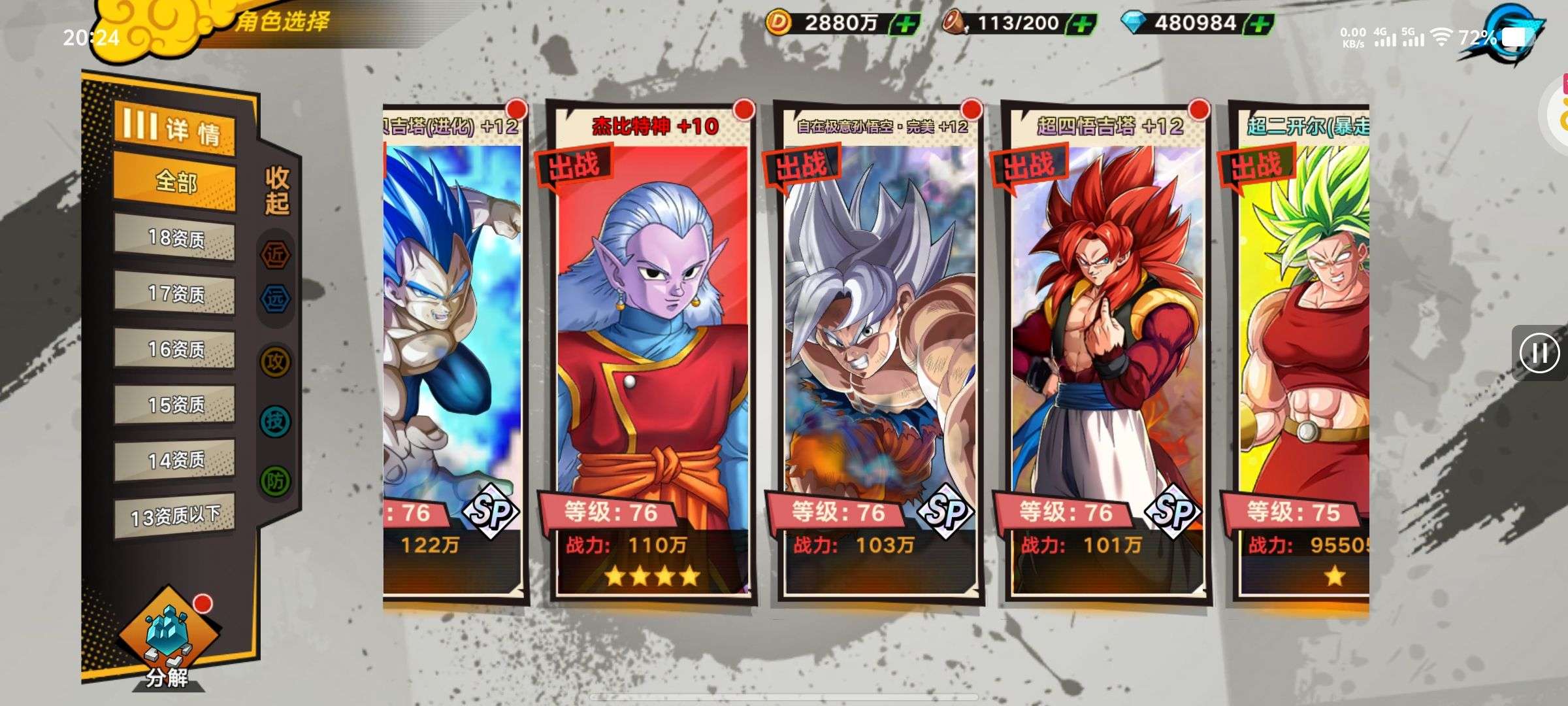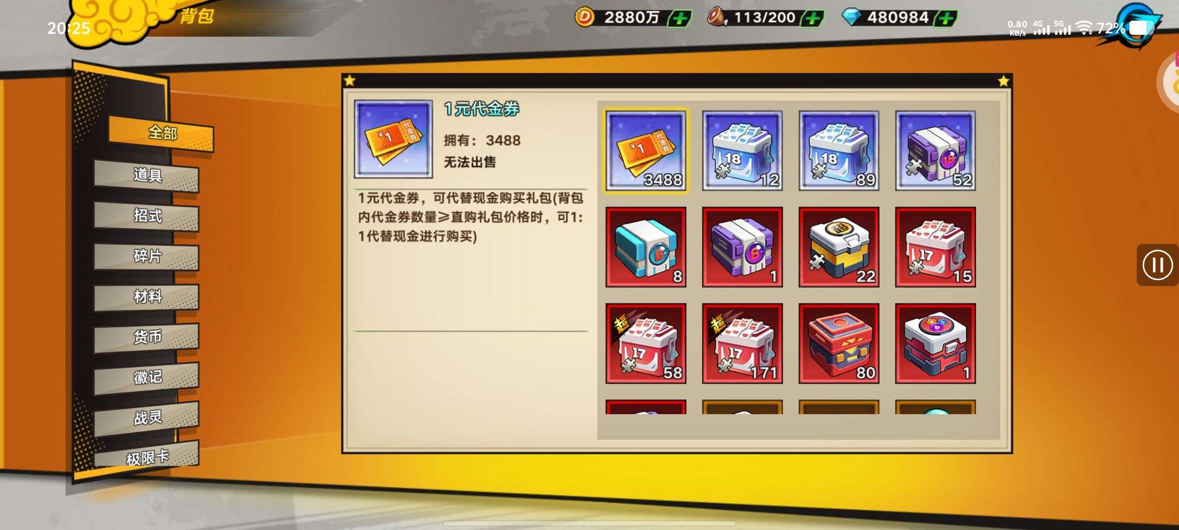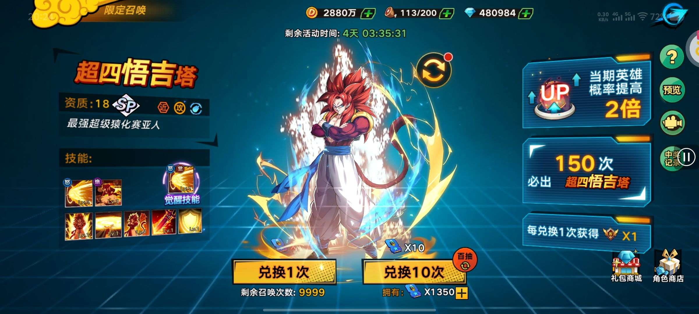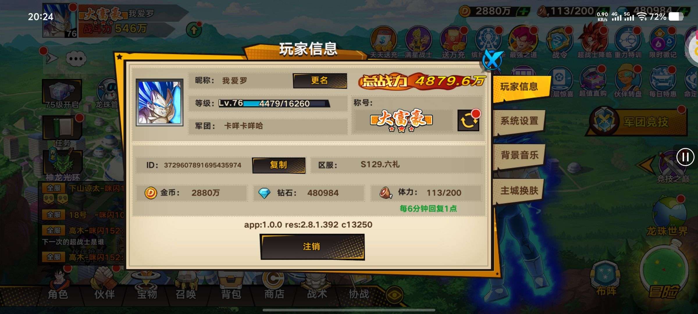总战力:4879.6万 金币:2880万 钻石:480984 代金券:3488 sp连抽次数:1350