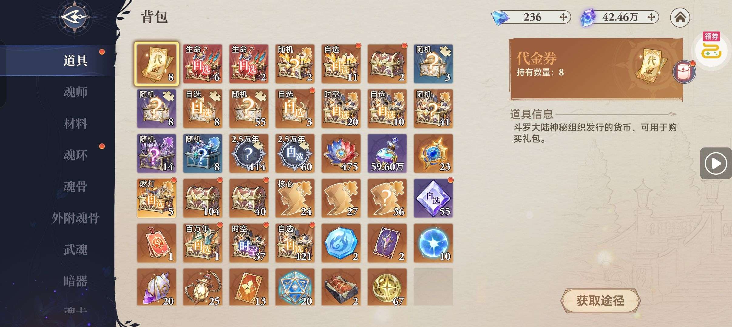 魂晶*888,魂师召唤券*10,武魂水晶*5(每个账号限领一次)