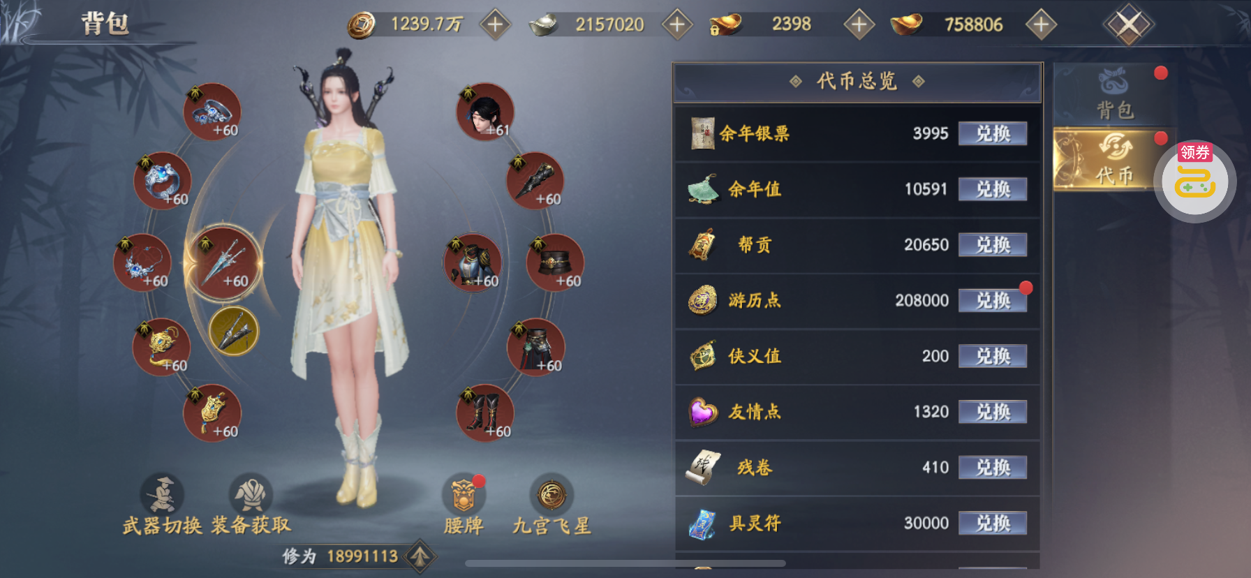30张648真充卡豪礼、侠客灵丹*10、侠客神丹*10、侠客金丹*1、专属挑战令*1(每个账号限领一次)