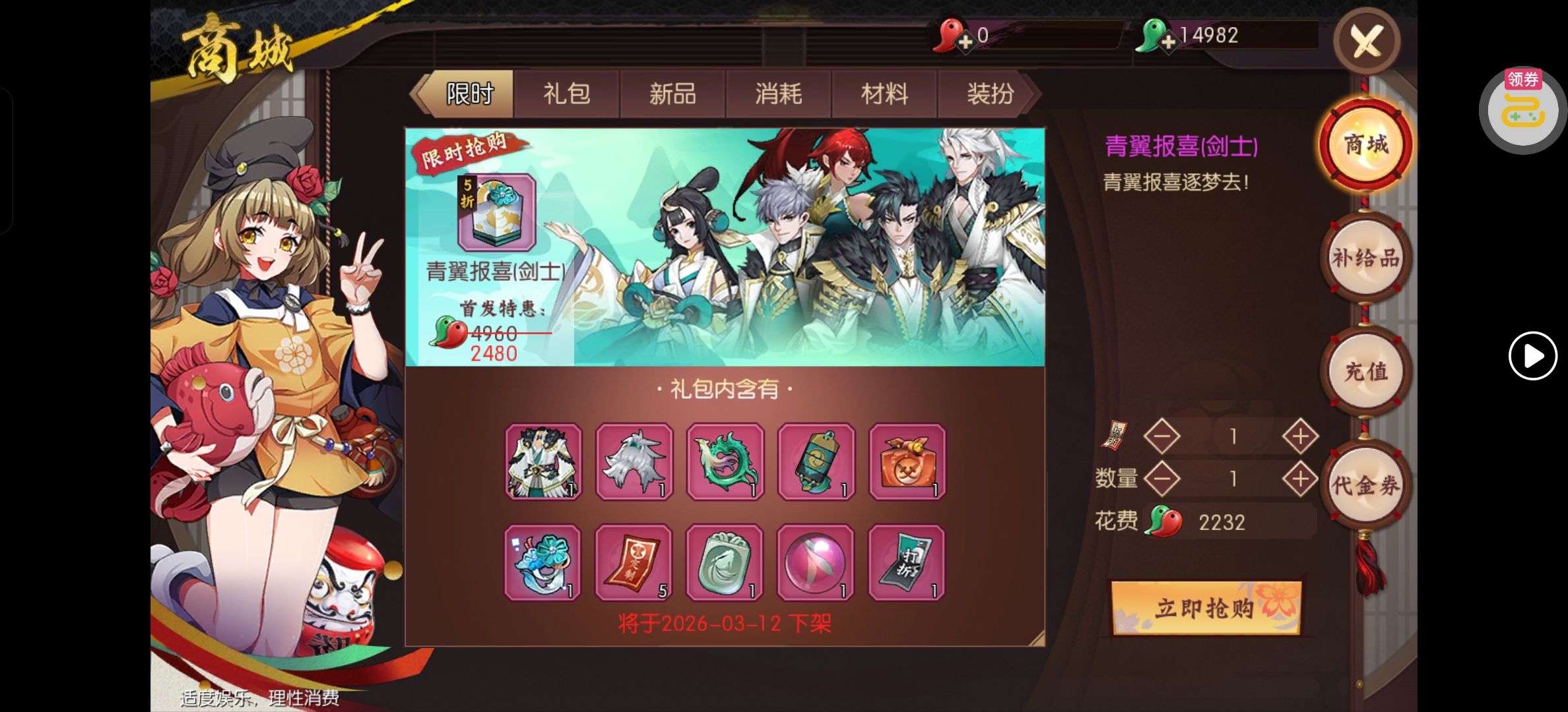 崩解4+神魔2+雷属小小居合,没有白天空没有白天空没有白天空,没有金币没有代金券没有火属,祝大家马年快乐