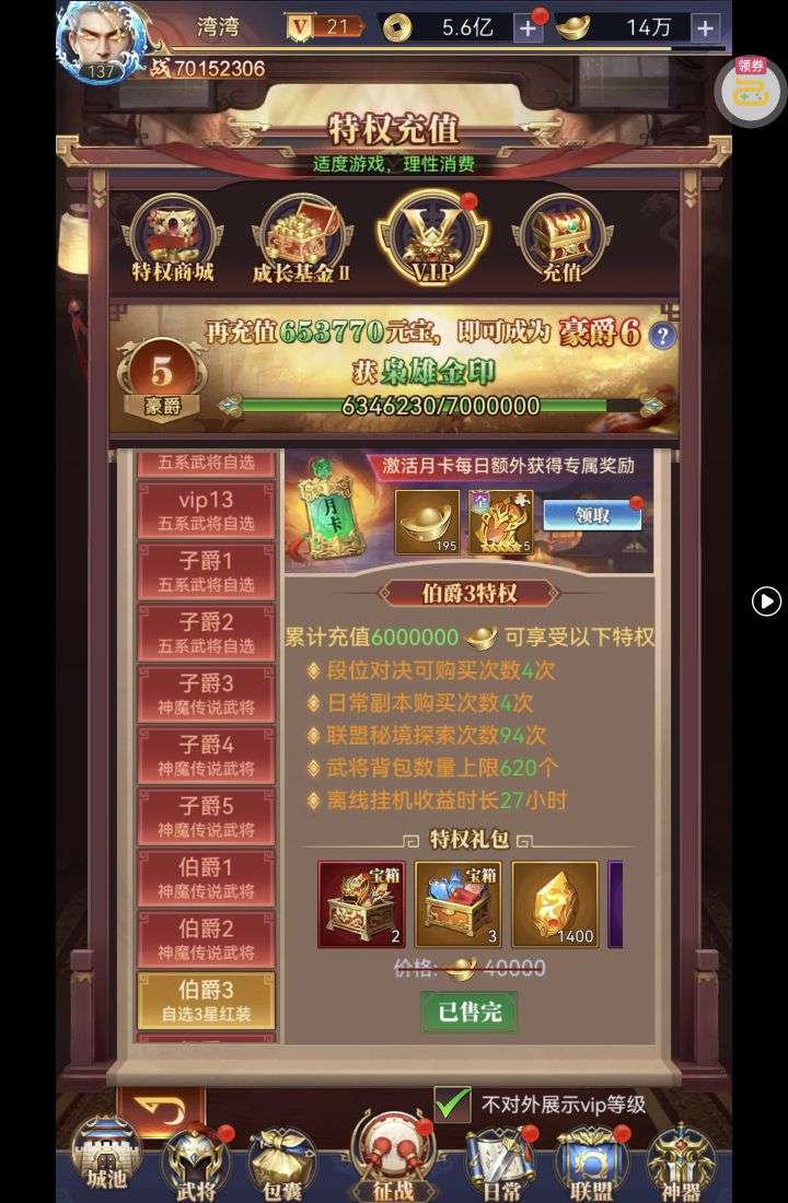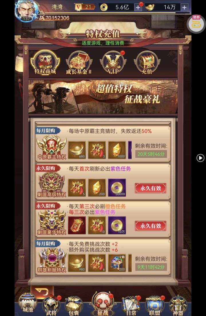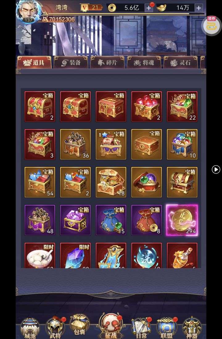 夺宝券*1、比武令*1、5星随机将魂*10(每个账号限领一次)