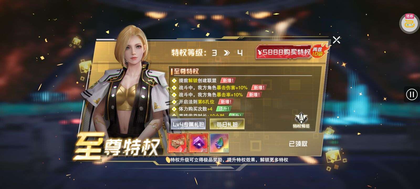 强化药剂*200、钻石招募币*20、金币*50W(每个账号限领一次)