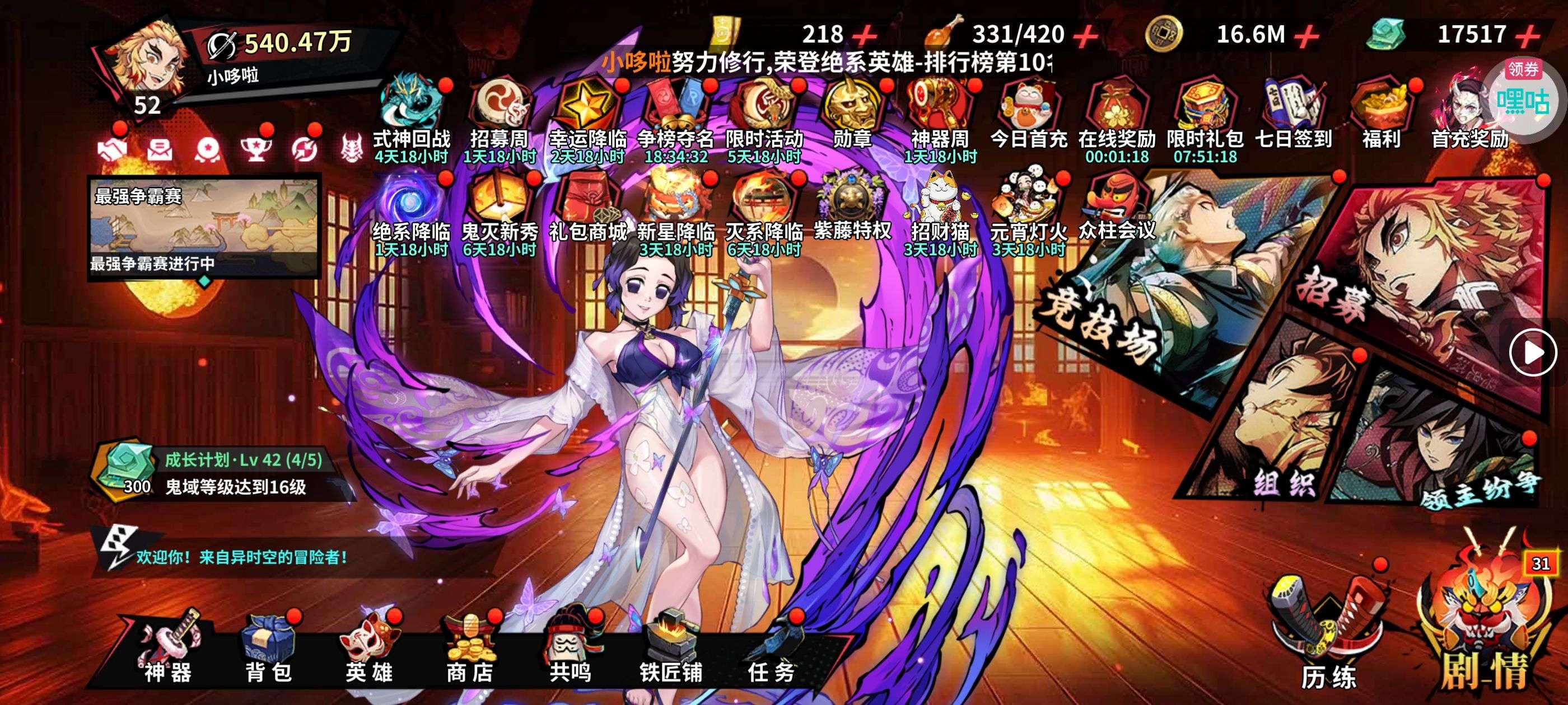 夺宝券*1、比武令*1、5星随机将魂*10(每个账号限领一次)