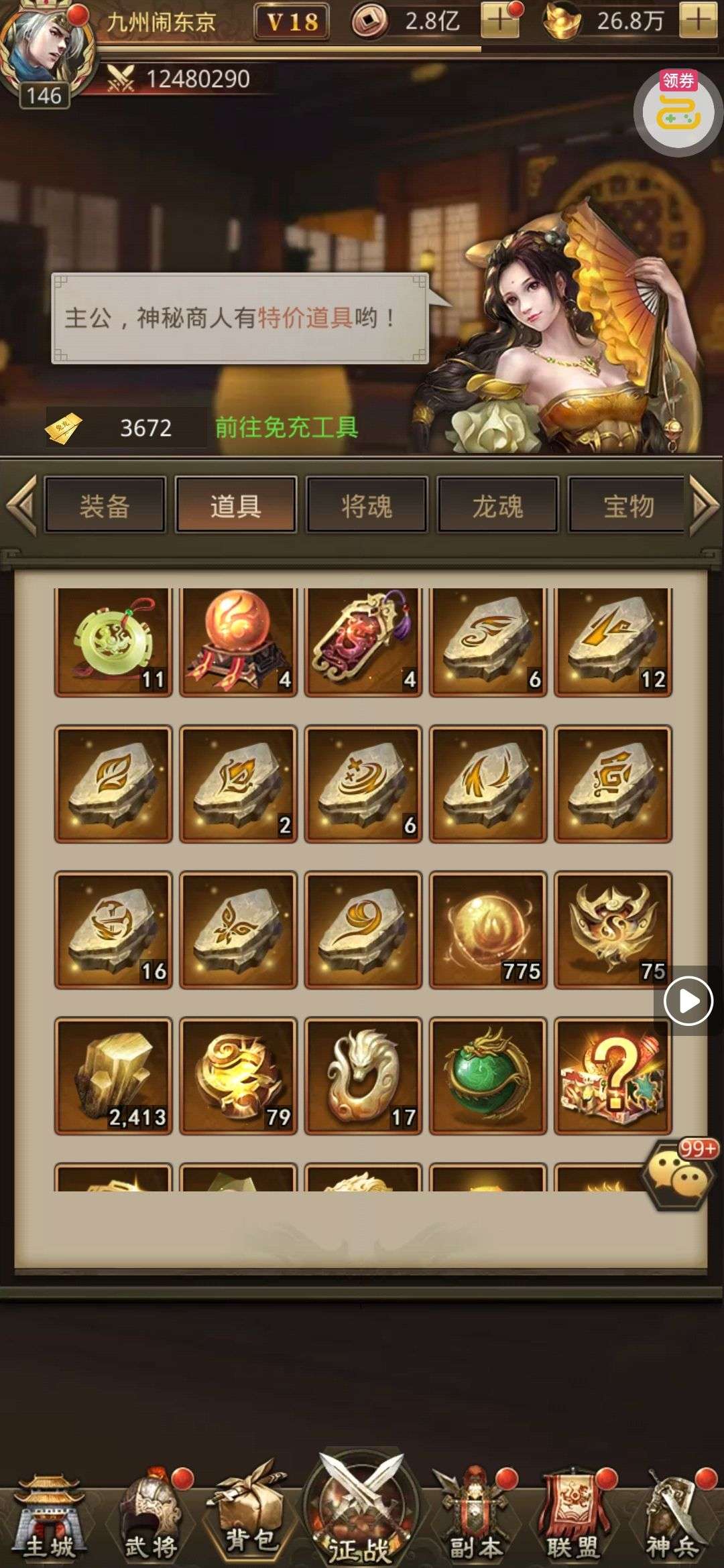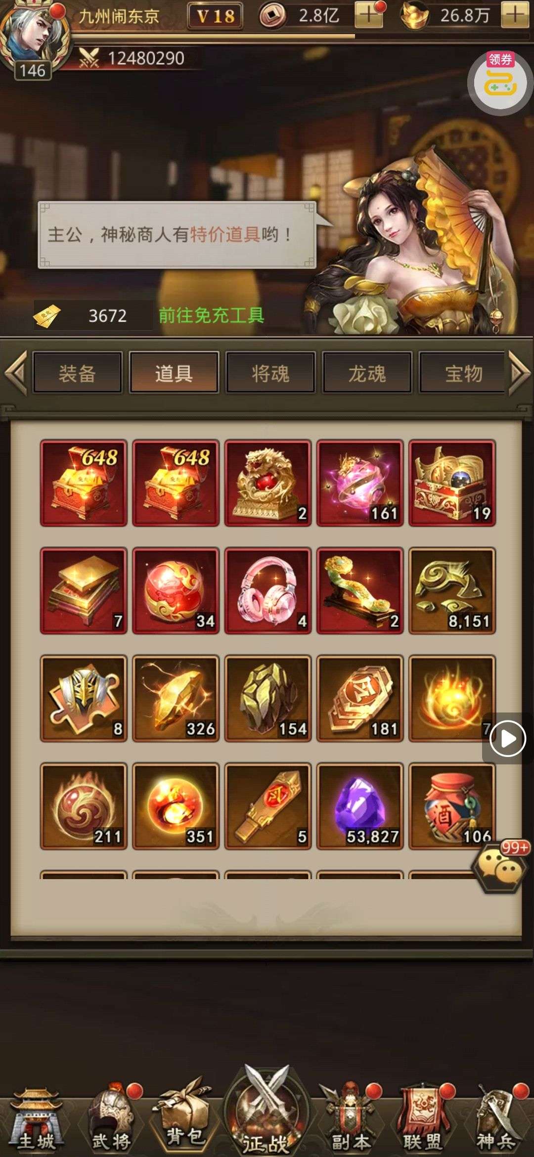 夺宝券*1、比武令*1、5星随机将魂*10(每个账号限领一次)