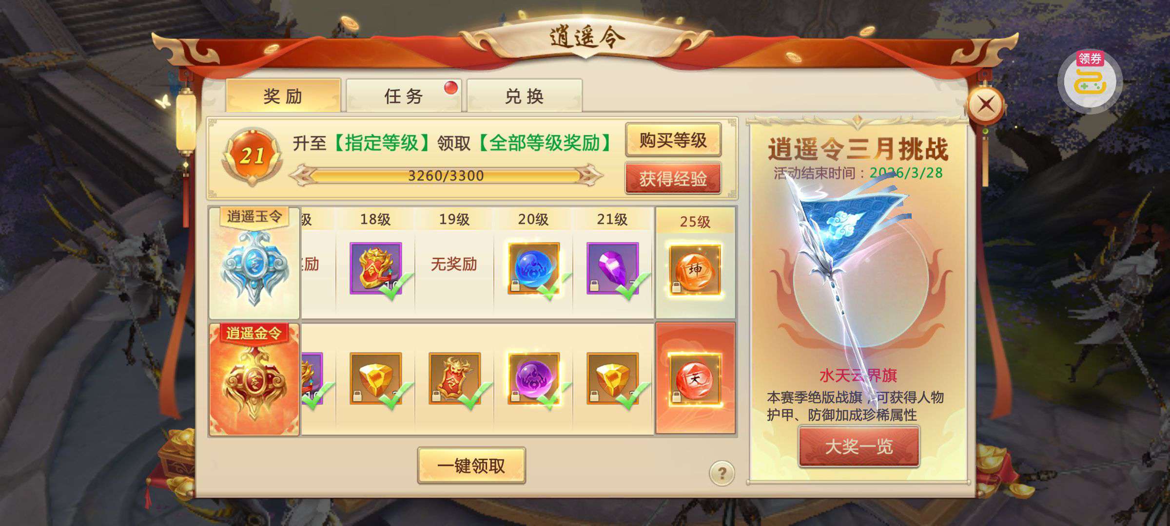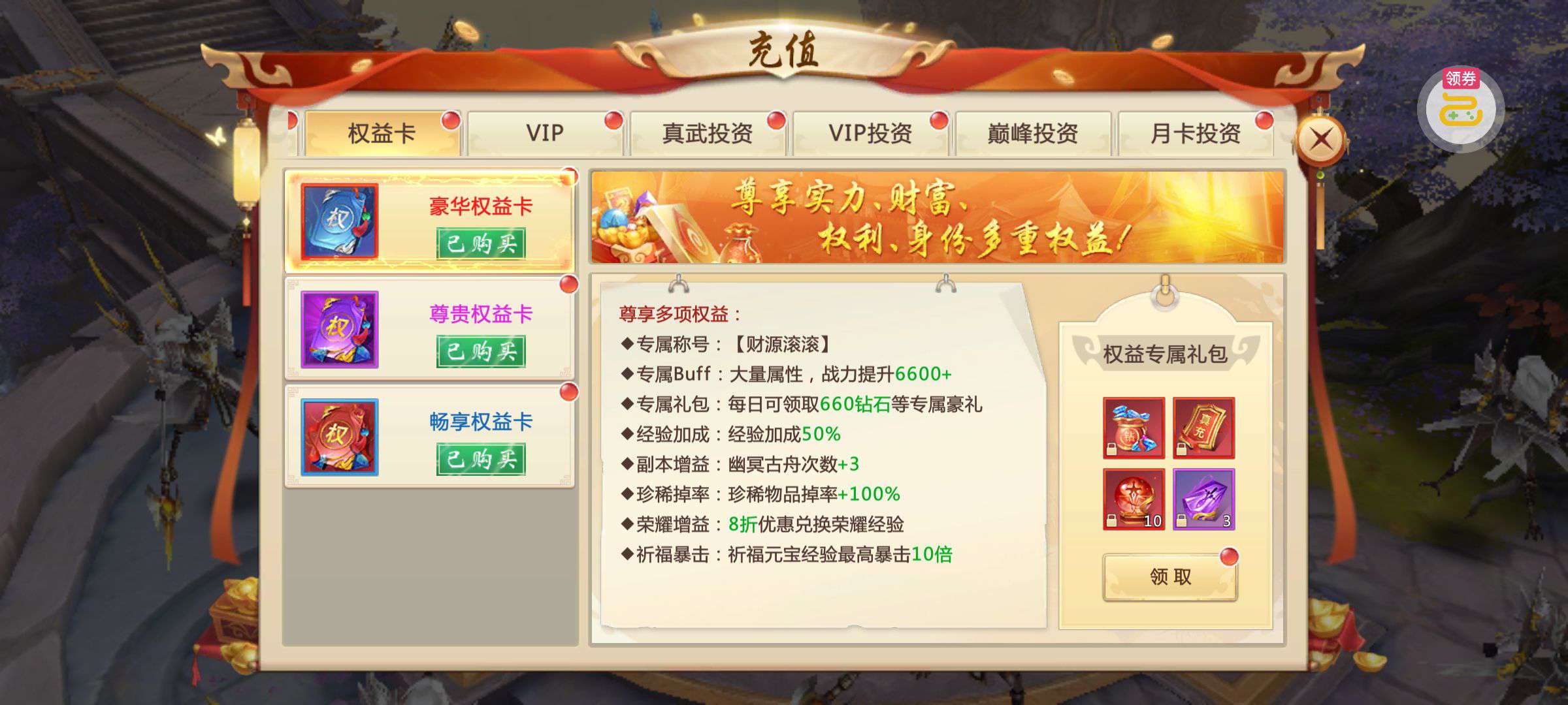 夺宝券*1、比武令*1、5星随机将魂*10(每个账号限领一次)