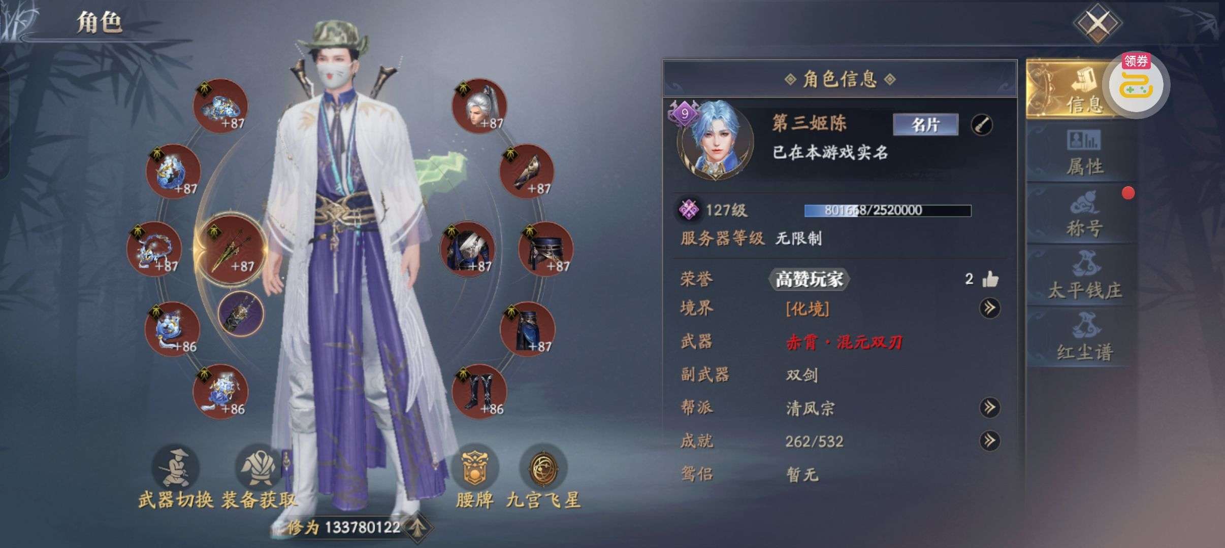 该角色累计充值 998.62元。 购买须知: 1.购买后支持回收或再次出售,不支持转区。 2.回收金额仅计算该小号购买后的充值金额,不计算购买前原有充值金额。 3.再次出售需等待购买72小时后,累充显示该小号总充值金额。