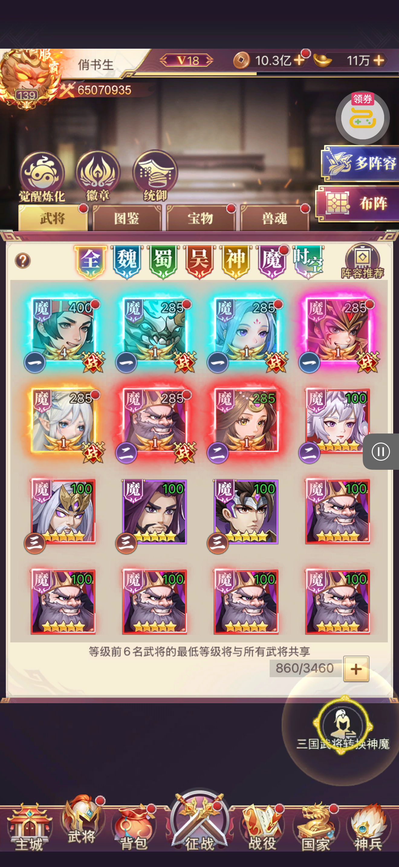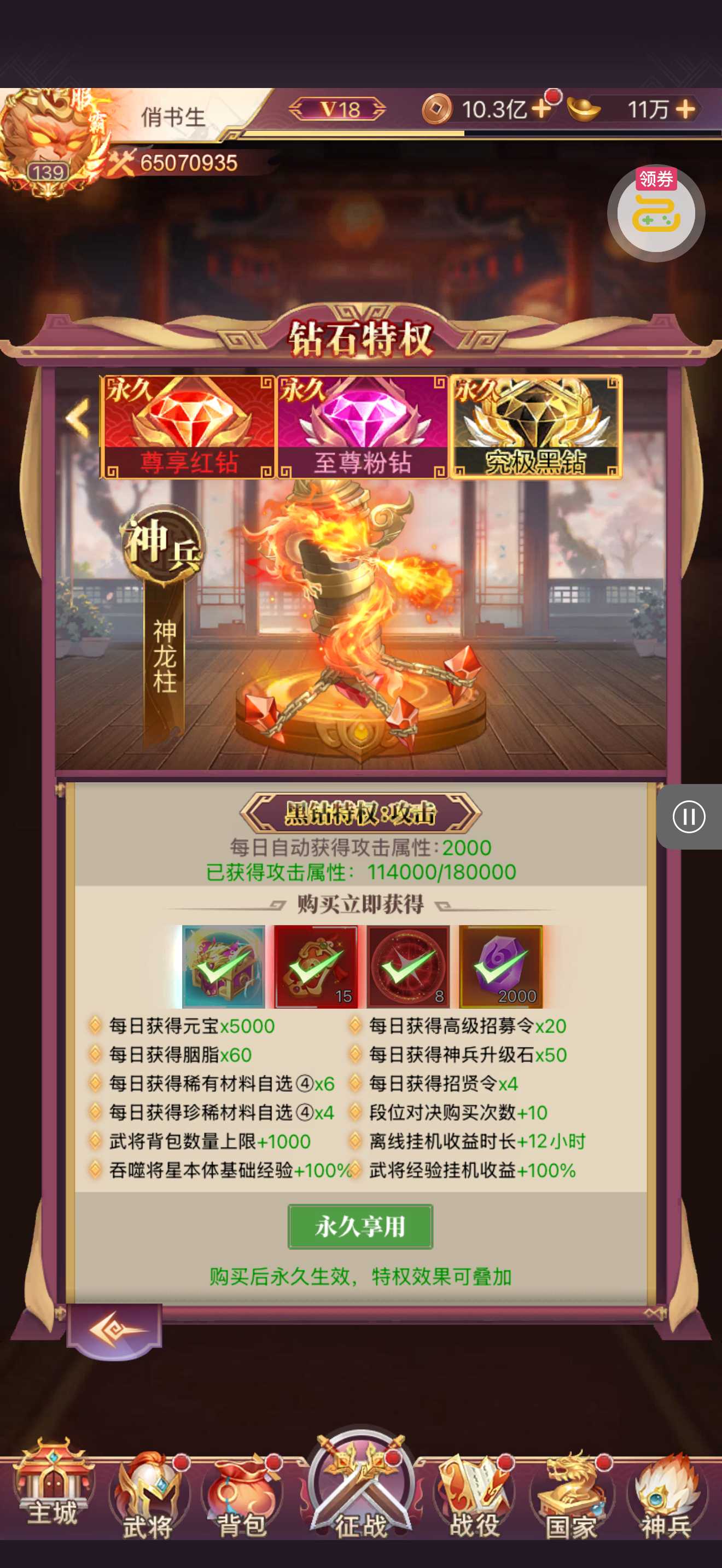 夺宝券*1、比武令*1、5星随机将魂*10(每个账号限领一次)