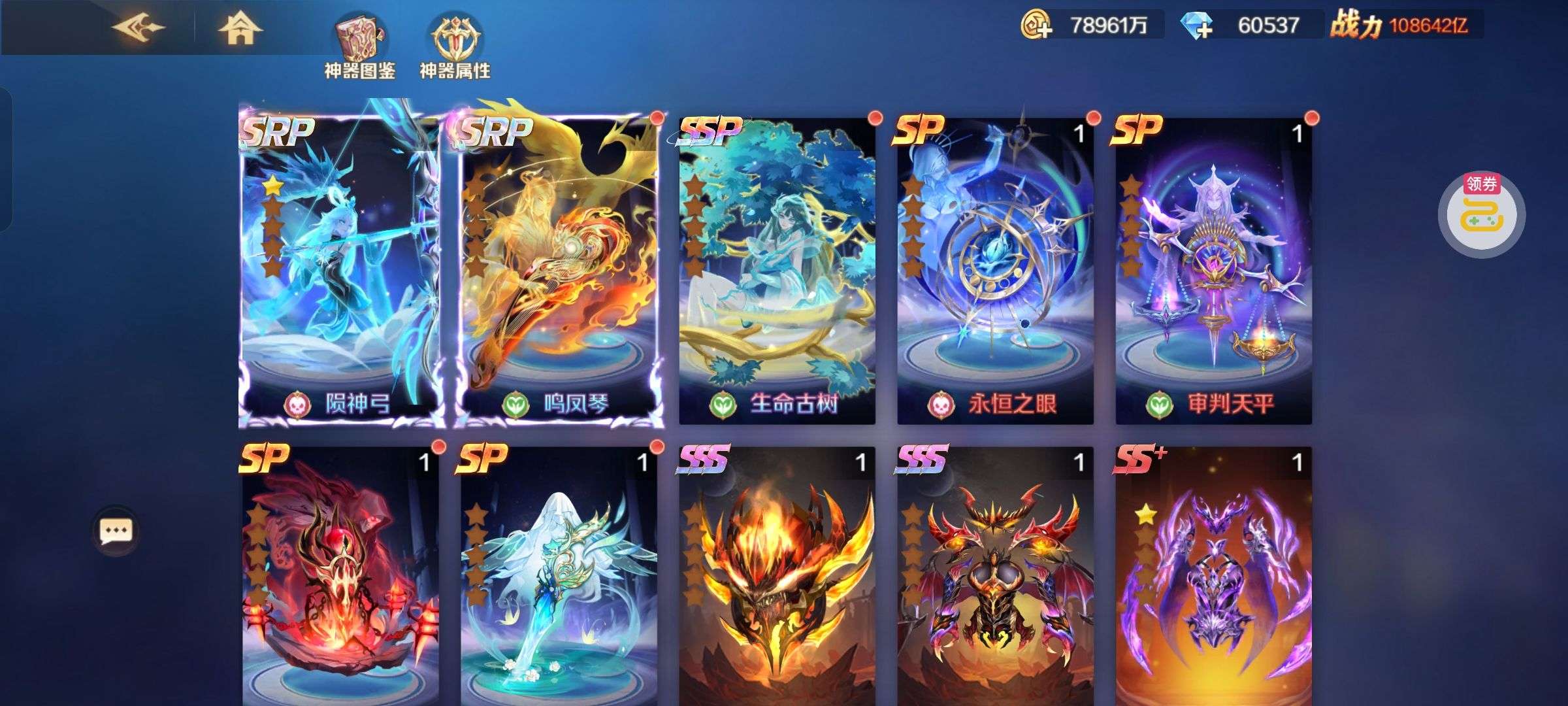 夺宝券*1、比武令*1、5星随机将魂*10(每个账号限领一次)