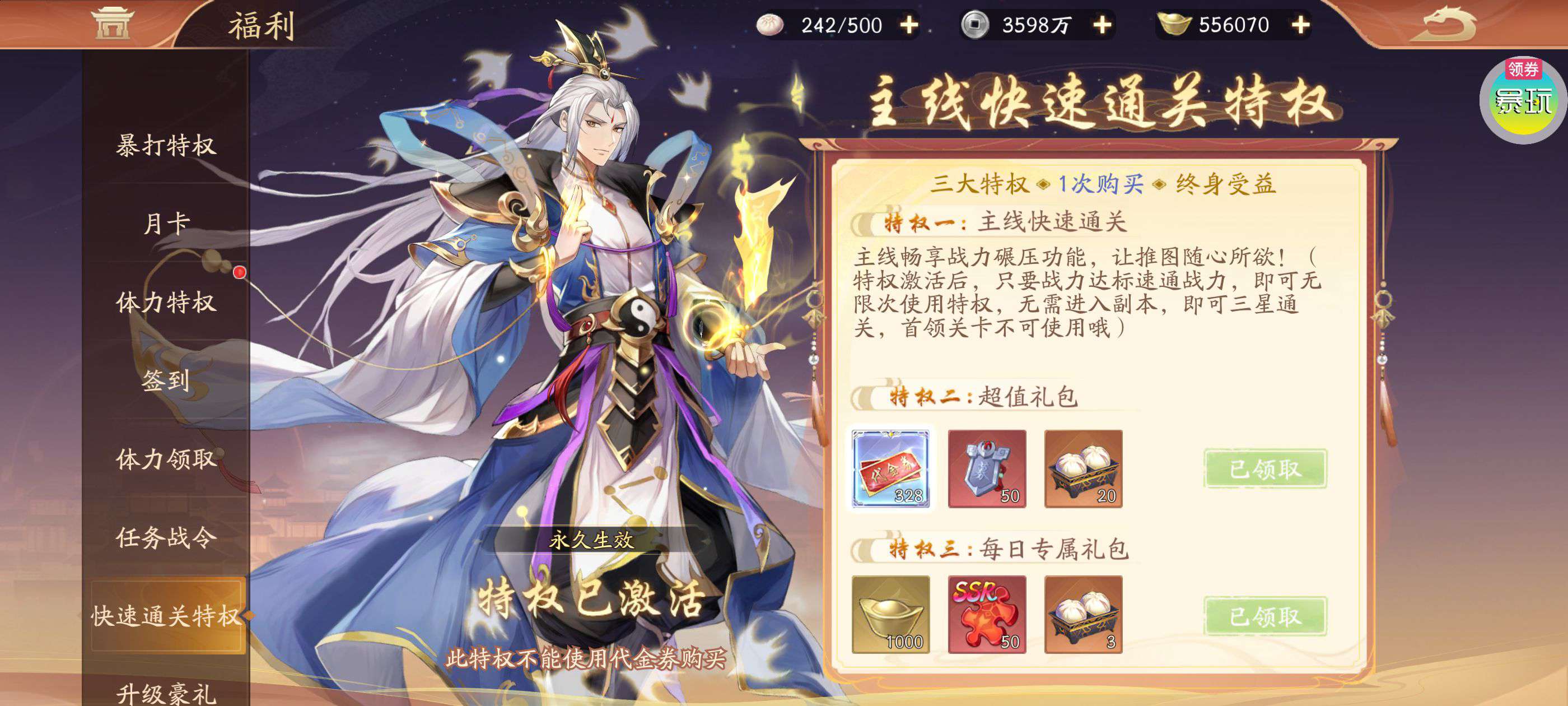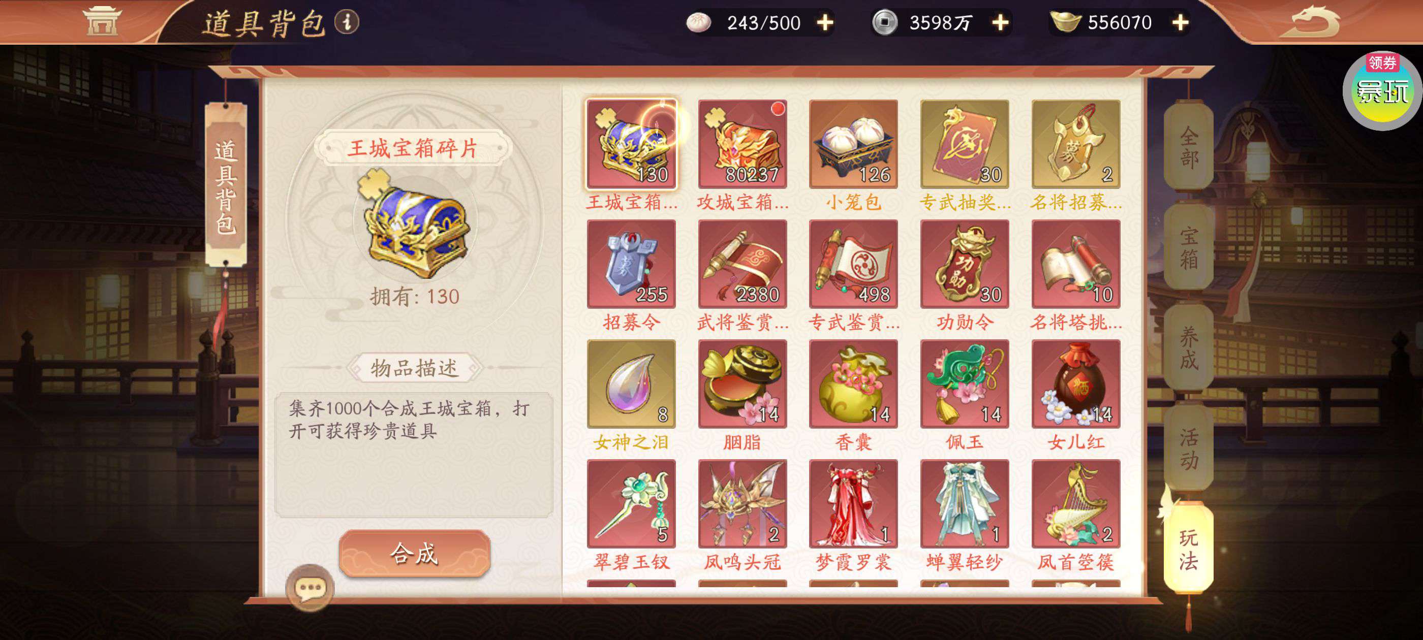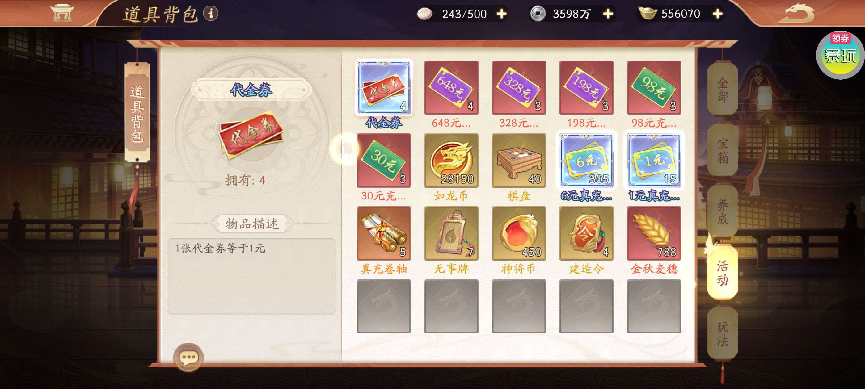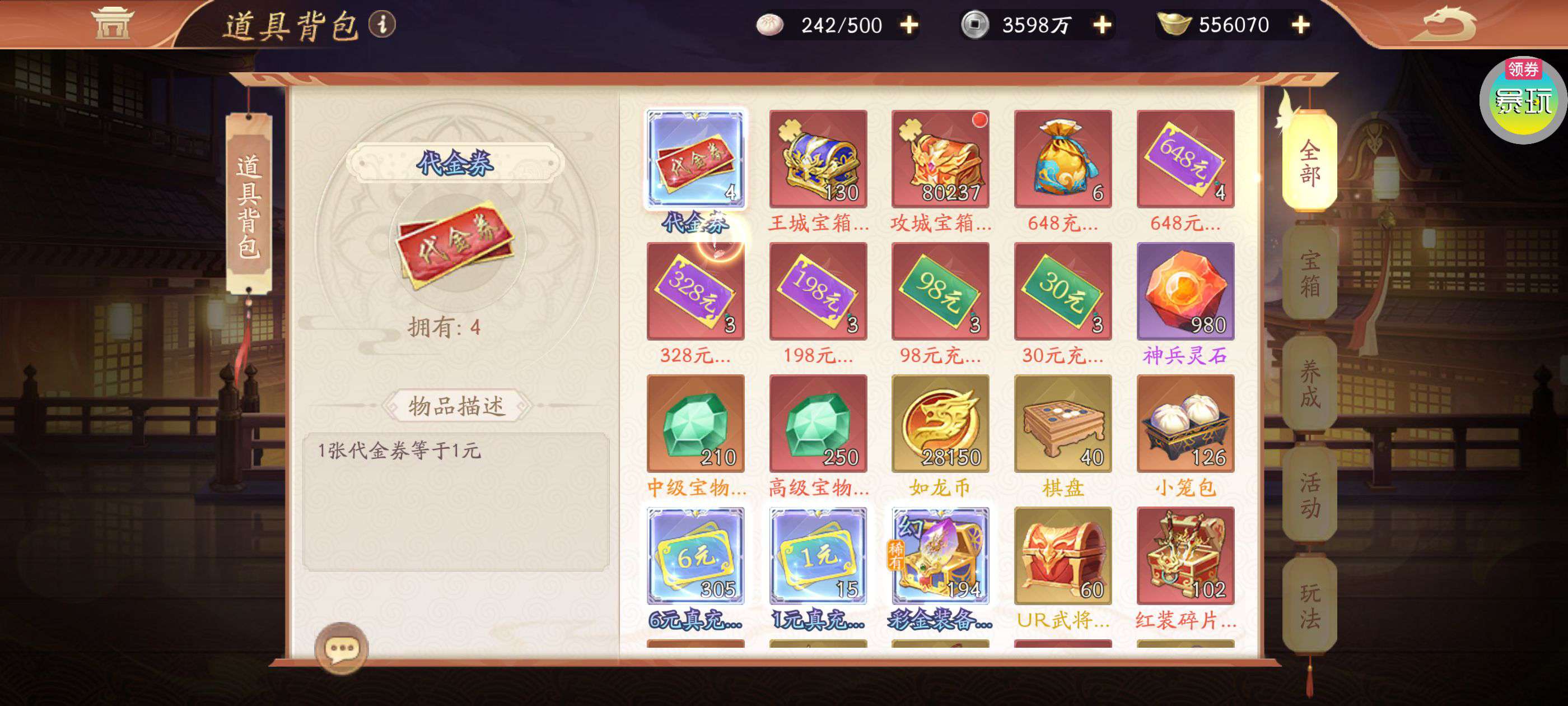 夺宝券*1、比武令*1、5星随机将魂*10(每个账号限领一次)
