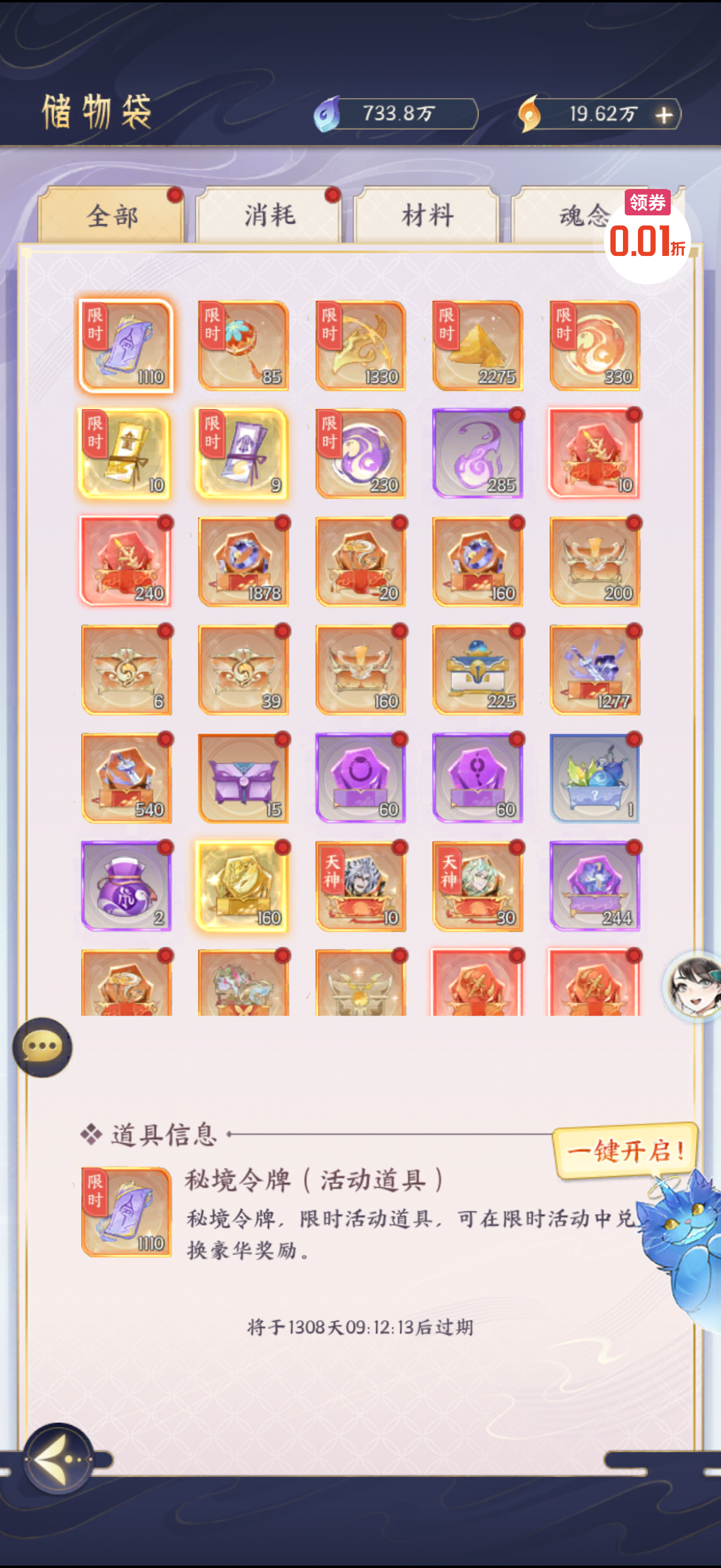 夺宝券*1、比武令*1、5星随机将魂*10(每个账号限领一次)