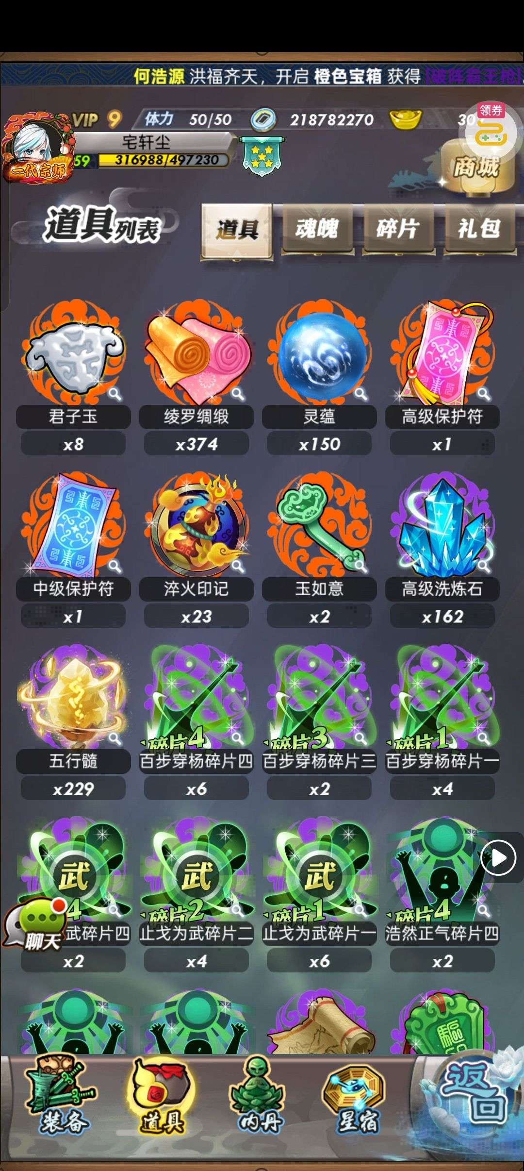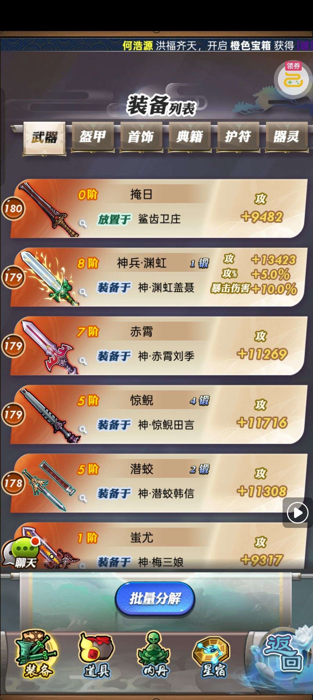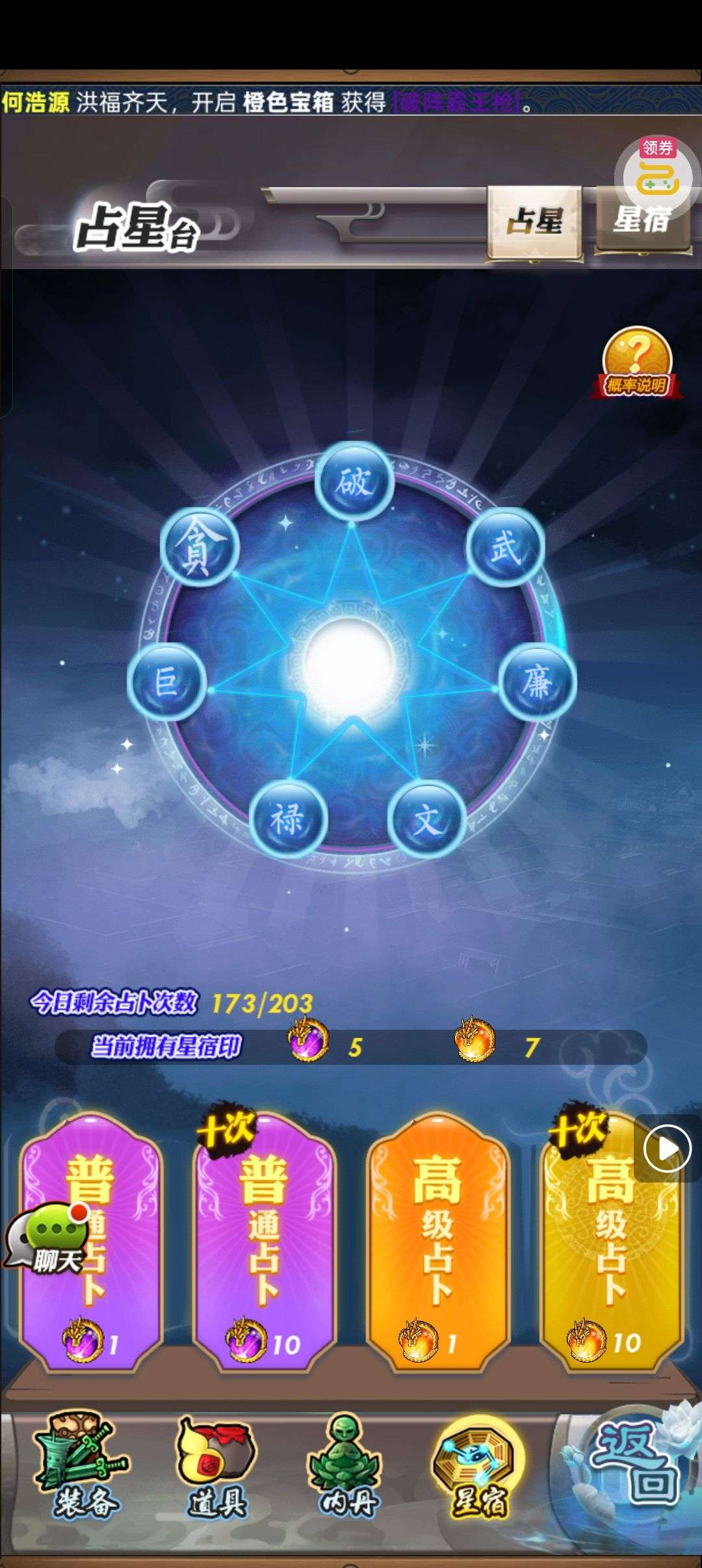 夺宝券*1、比武令*1、5星随机将魂*10(每个账号限领一次)