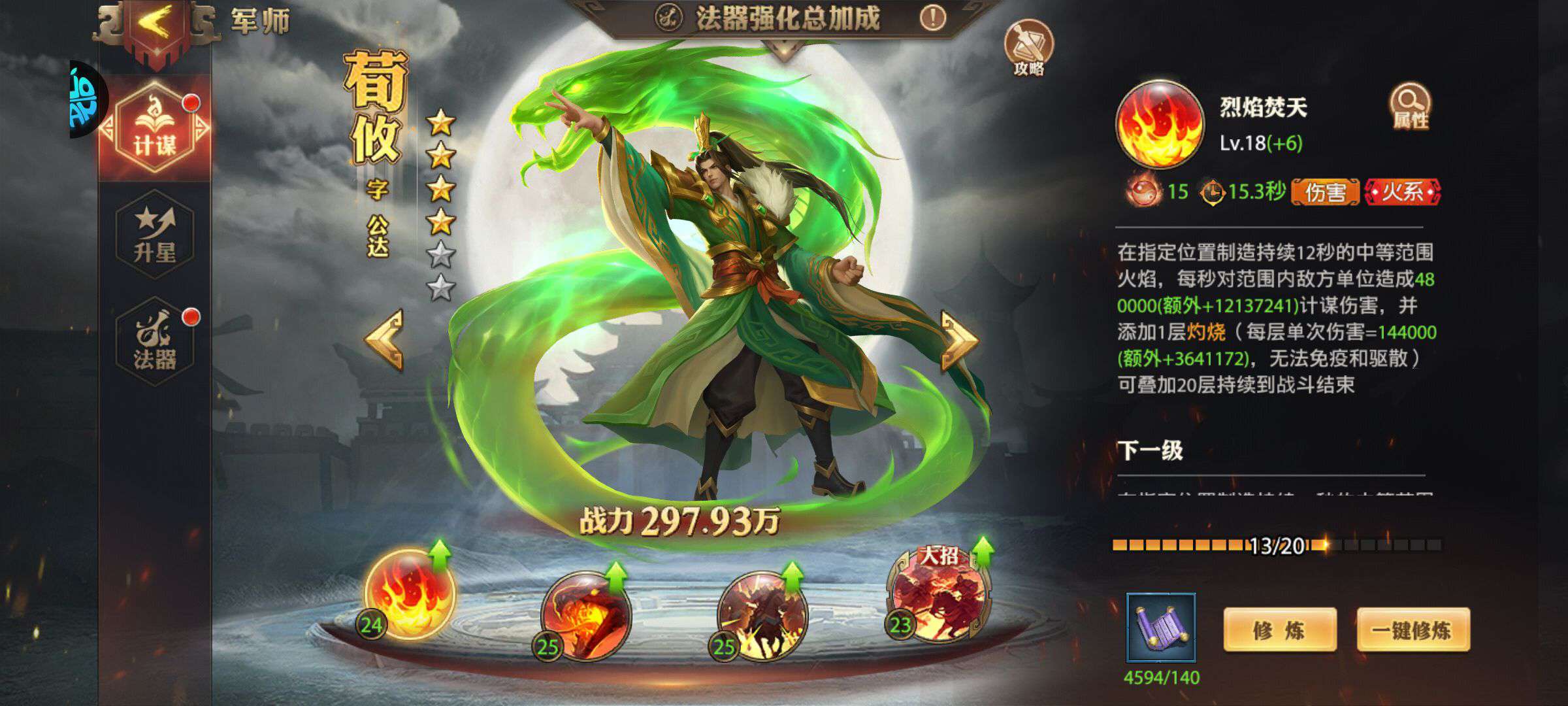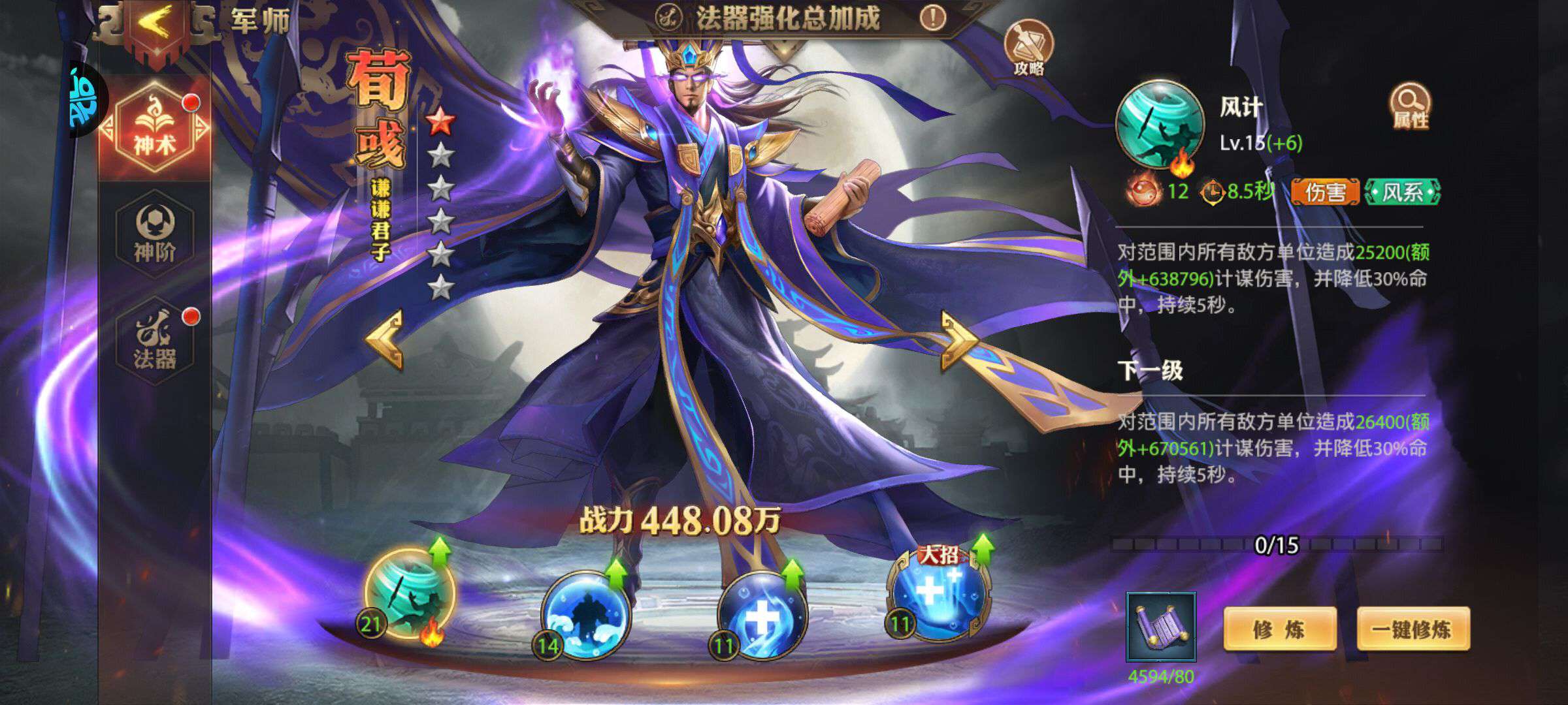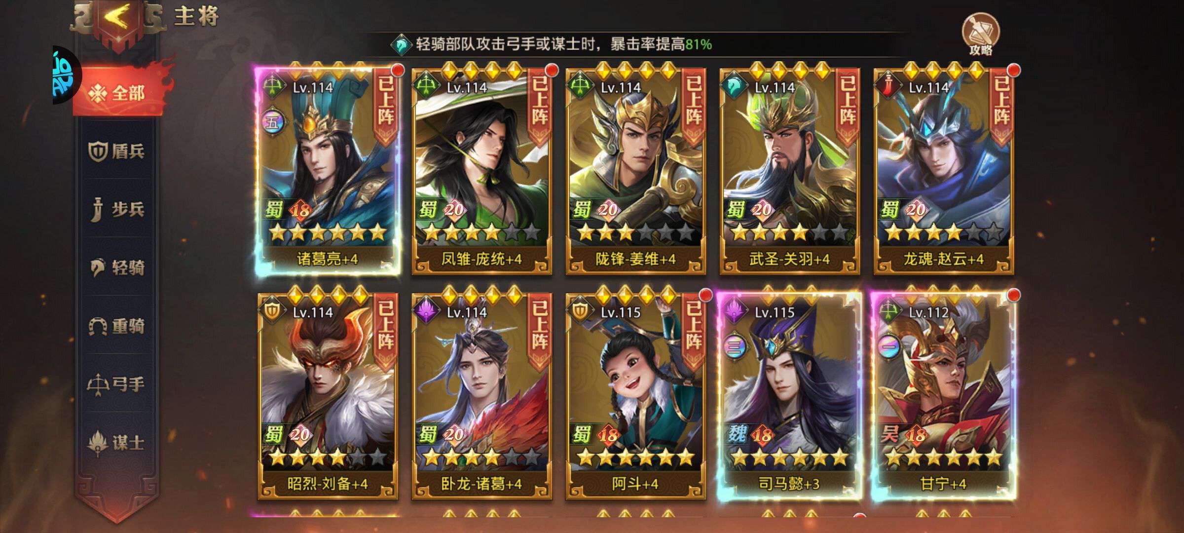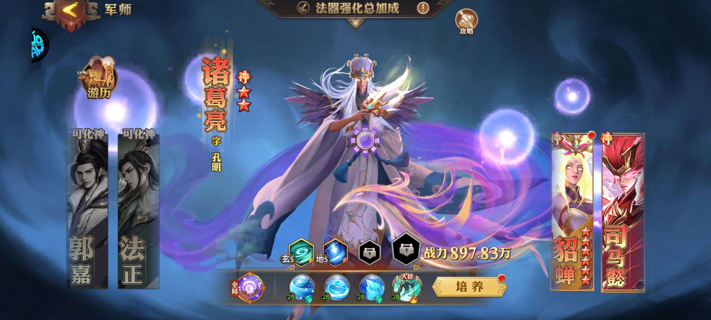 115级,所有军师都有,花钱的军师有荀攸和南华,神兽玄武2星,20将,专属坐骑,士兵,专武全部有,诸葛亮觉醒5,司马懿觉醒3,