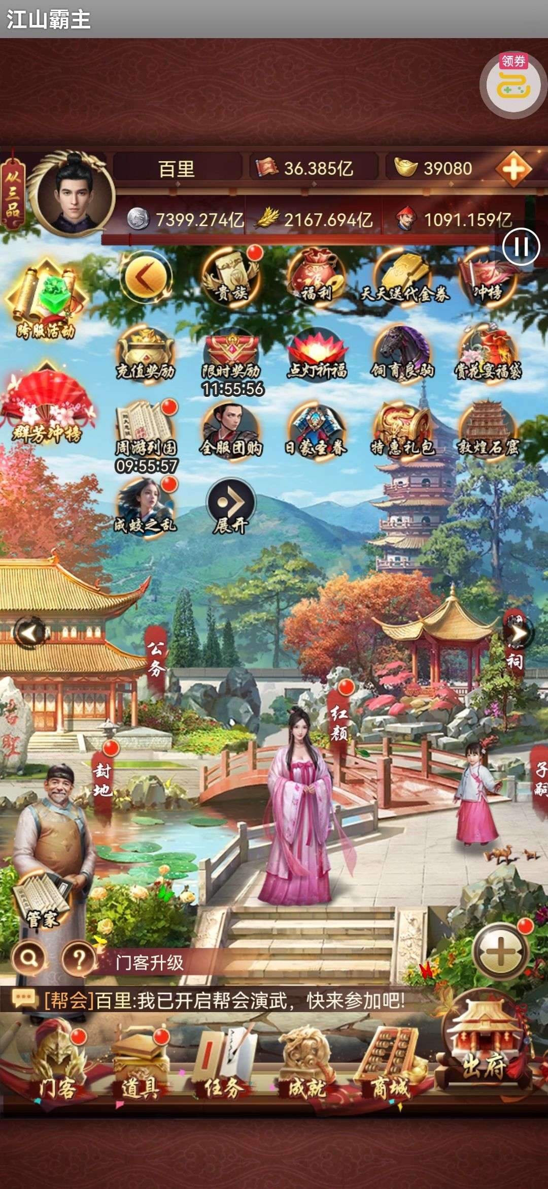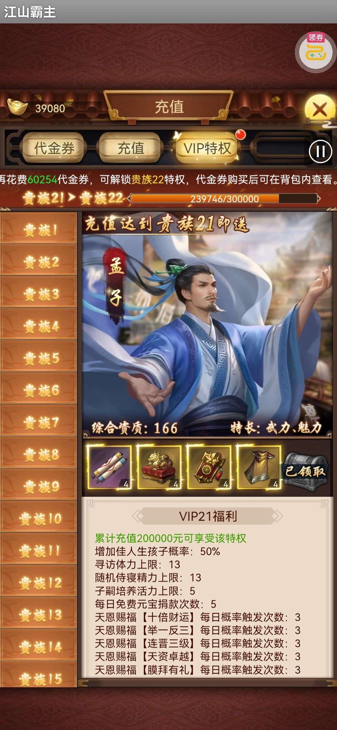 135亿战力。天神将+up将,主妃22w,VIP23。黄金阵容,资源库看图