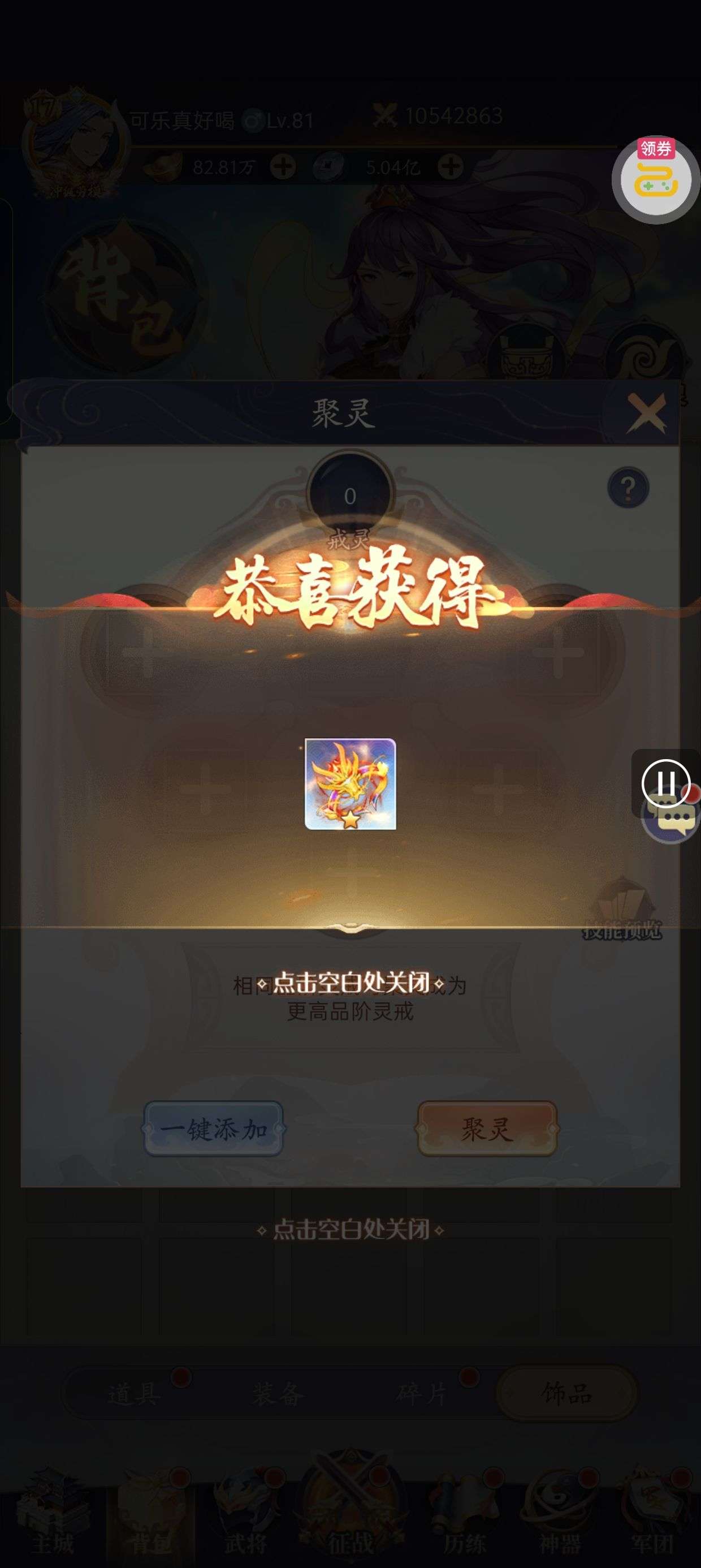 夺宝券*1、比武令*1、5星随机将魂*10(每个账号限领一次)